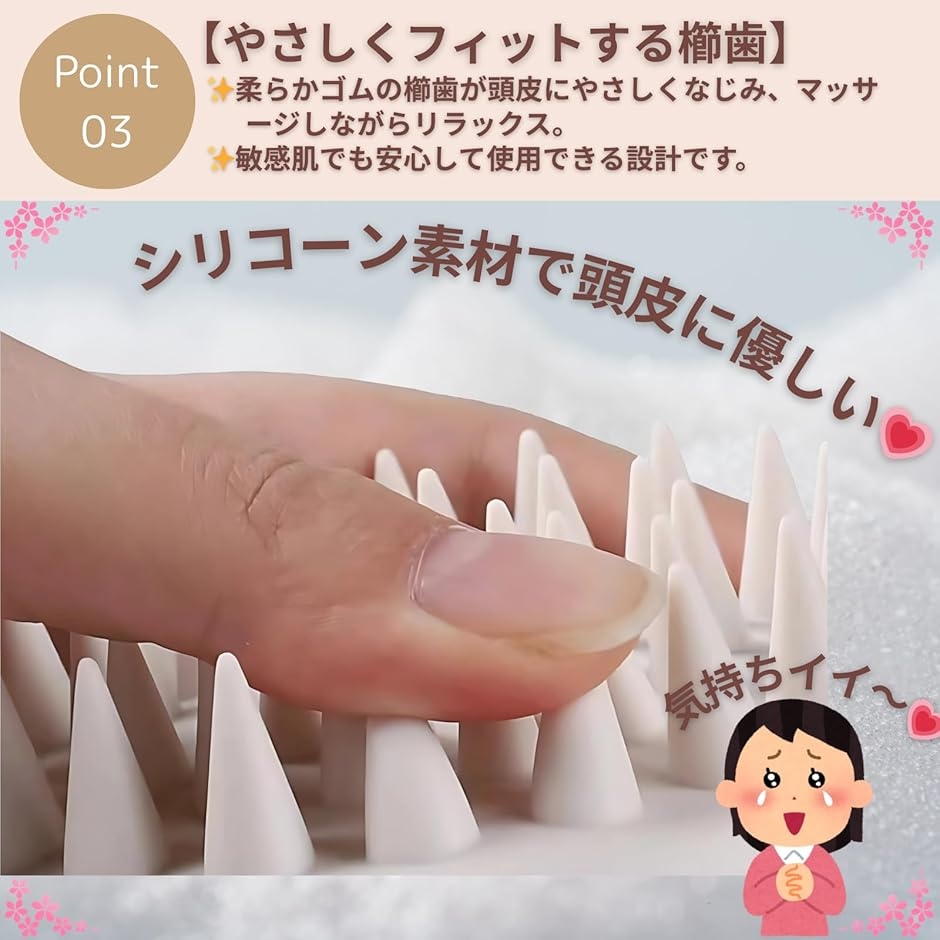「やさしくフィットする櫛歯」 柔らかゴムの櫛歯が頭皮にやさしくなじみ、マッサージしながらリラックス。