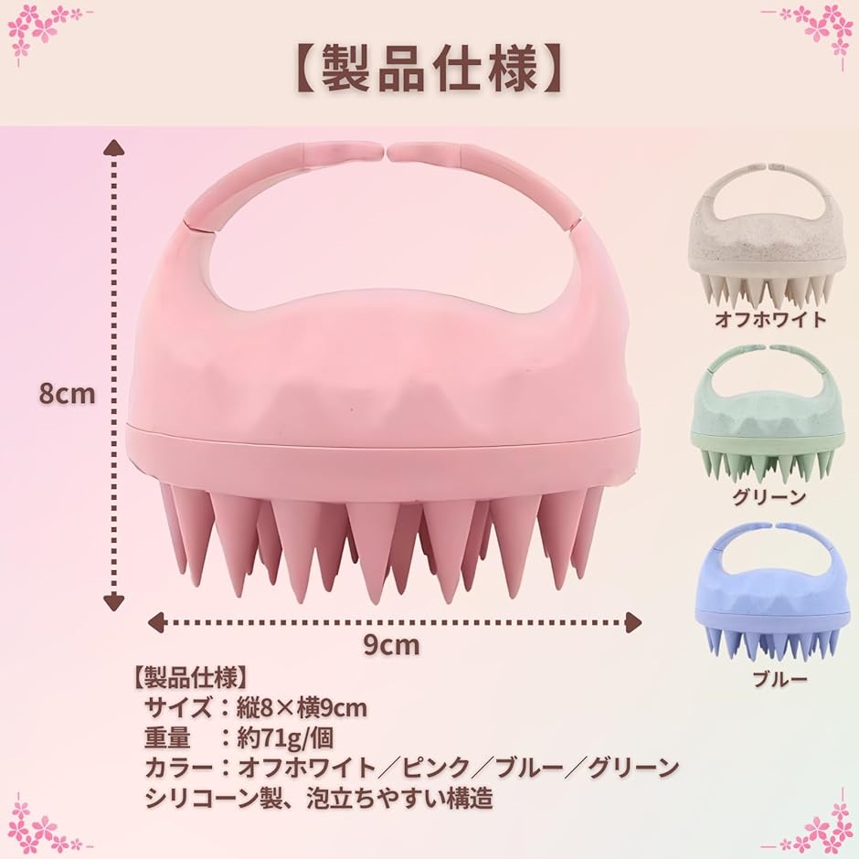 「製品仕様」 サイズ:縦8x横9cm(1個)、重量:71g/個、カラー:オフホワイト/ピンク/ブルー/グリーン、シリコーン製、泡立ちやすい構造、2個セット。