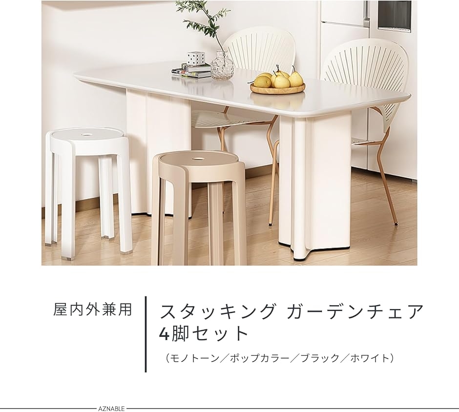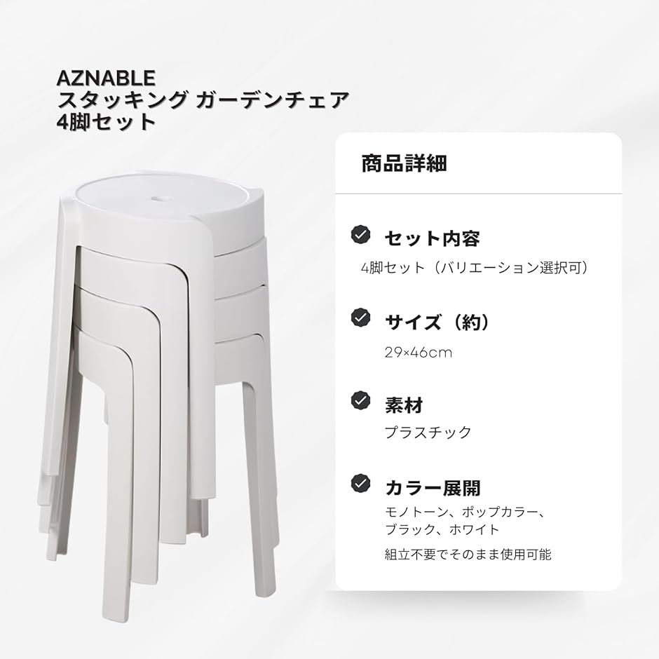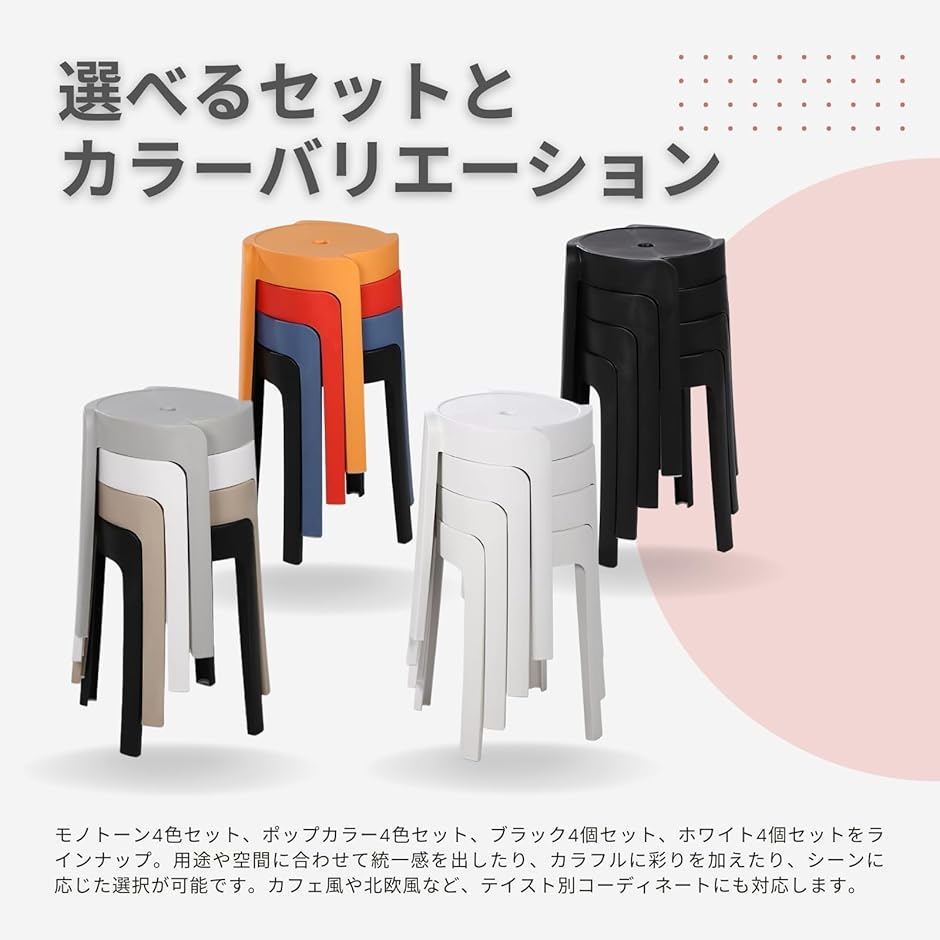 「商品詳細」 セット内容:4脚セット(バリエーション選択可) サイズ(約):画像参照 素材:プラスチック カラー展開:モノトーン、、ポップカラー、ブラック、ホワイト 組立不要でそのまま使用可能