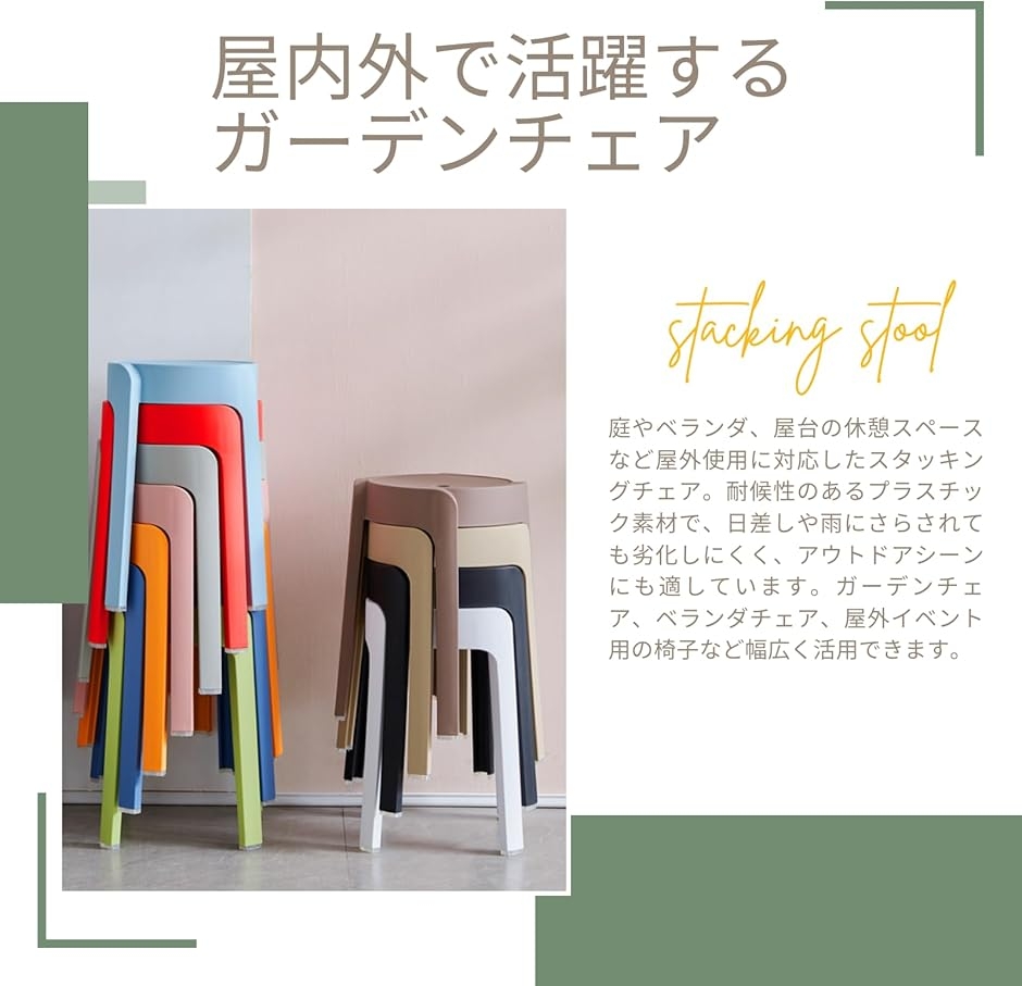 「屋内外で活躍するガーデンチェア」 ガーデンチェアとしても使えるスタッキングスツールは、屋外での使用にも適しています。