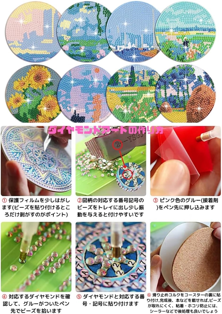 「ダイヤモンドアートコースターセットパッケージ内容」 *ダイヤモンドアートコースター:8枚 *コルクマット:8枚 *コースターホルダー:1台*カラフルなダイヤモンド:1セット*ビーズトレイ:1個、ダイヤモンドペン:1本 *グルー:1個*チャック付ビニール小袋:5枚 *日本語取扱説明書付