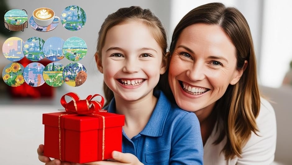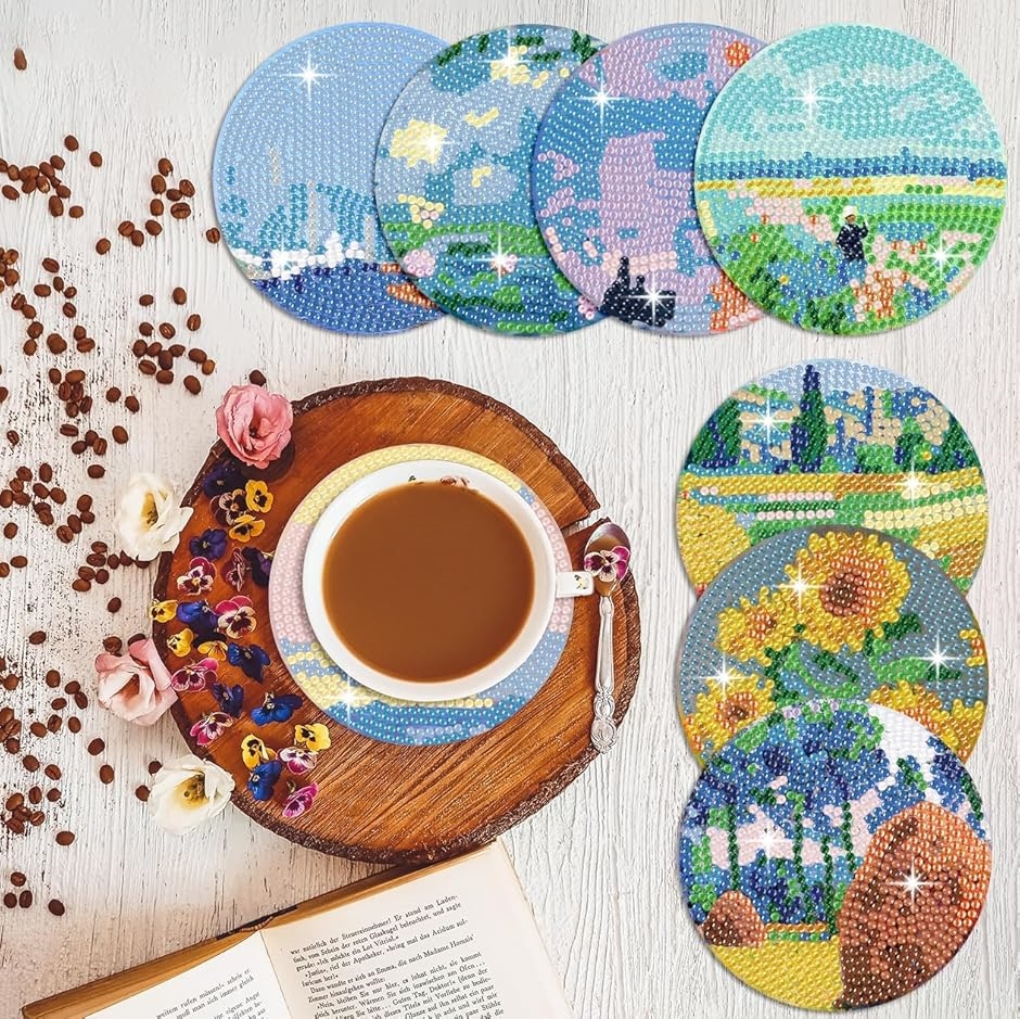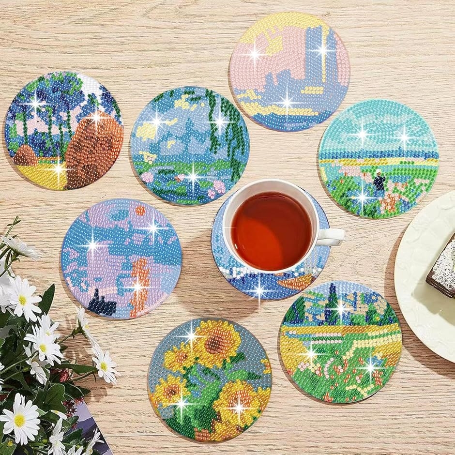「大切な人に手作りを贈ろう。 ダイヤモンドペイントコースターはギフトにも最適」 美しい輝きと温かさを兼ね備えた、手作りのダイヤモンドペイントコースター。