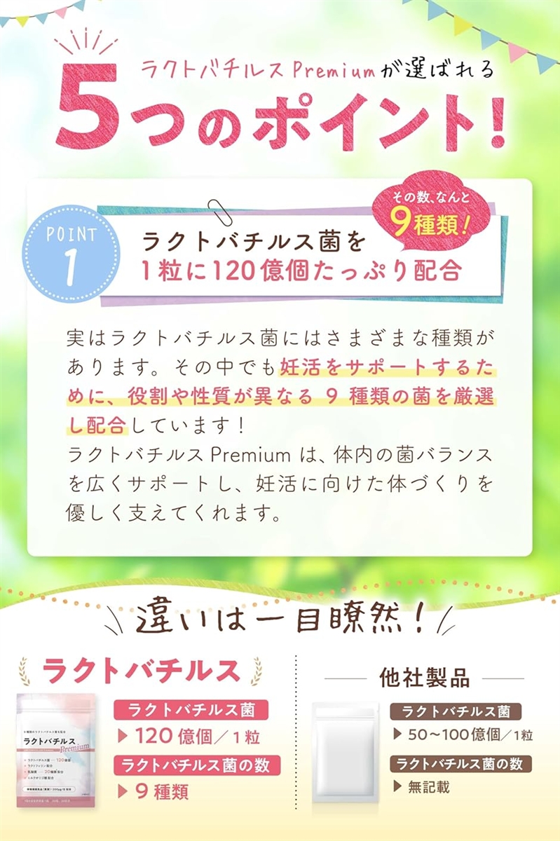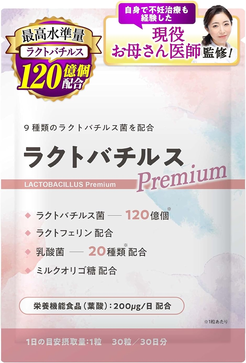 | 商品名 | 9種類120億個のラクトバチルス菌で子宮フローラをサポートラクトバチルスPremium サプリ お母さん医師監修葉酸200μgxラクトフェリン配合の栄養機能食品 |