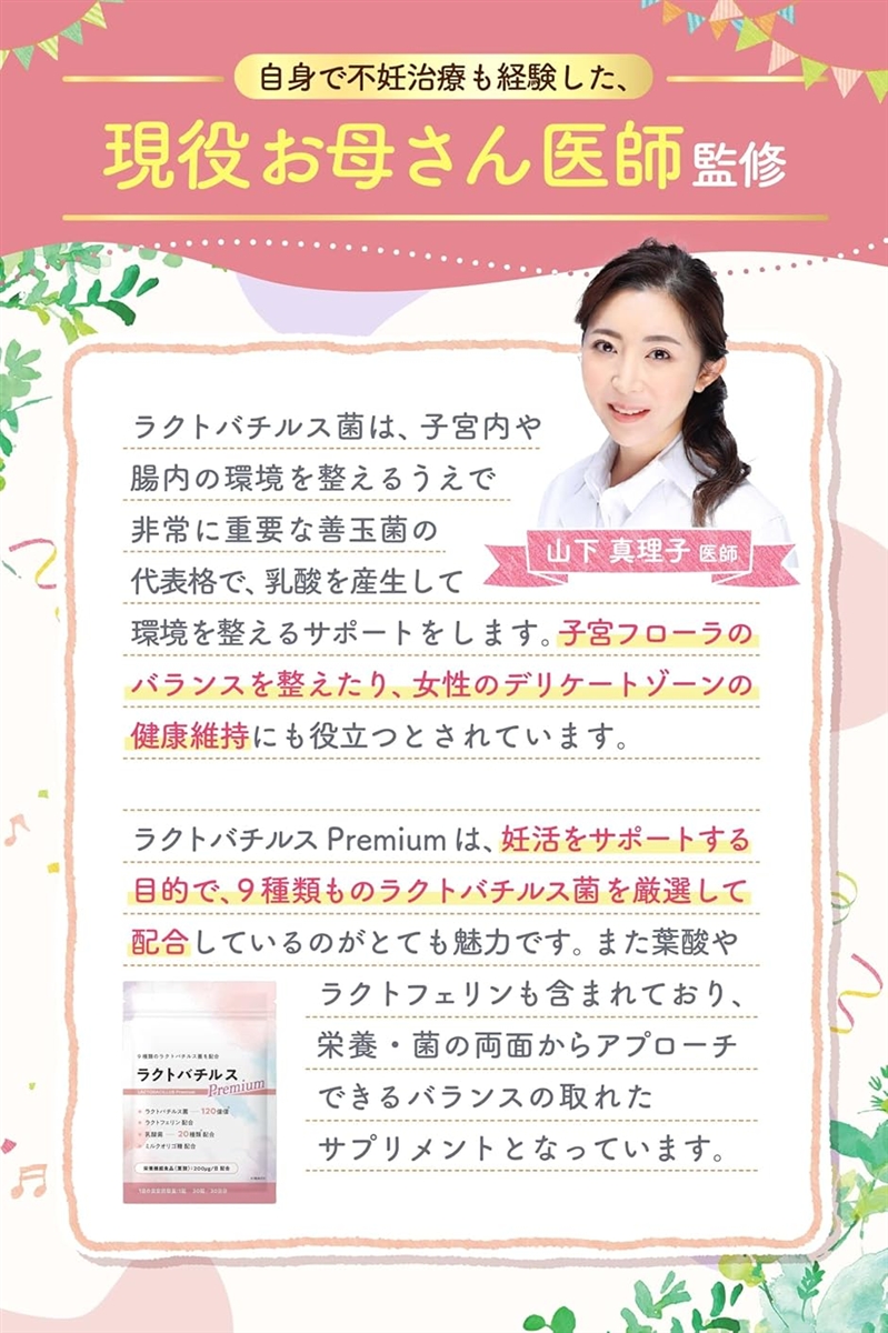 「現役ママ医師監修。話題の子宮フローラをサポートするサプリ」 妊活サポートのために、厳選した「120億個&9種類のラクトバチルス菌」を1粒に凝縮。