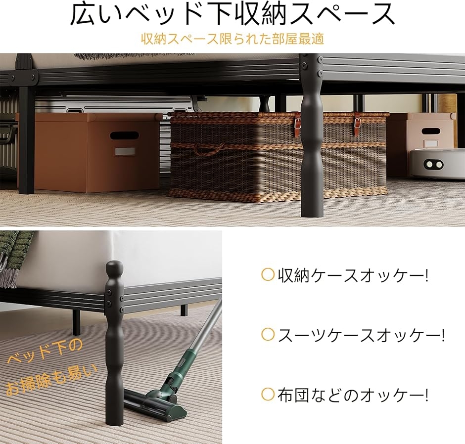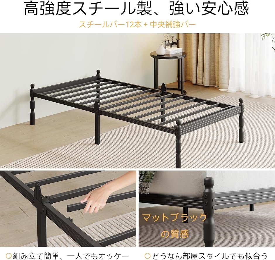 時間に耐える頑丈さ 本ベッドフレームは高強度スチールとすのこ構造を採用し、重いマットレスにも対応可能な優れた耐久性を実現。