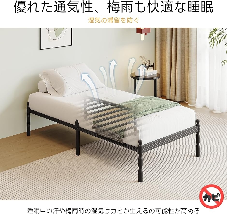 優れた通気性 通気性に優れたすのこ構造&パイプフレームにより、湿気や熱がこもりにくくて、木製ベッドに比べてお手入れも簡単で、清潔な睡眠環境を長く維持できます