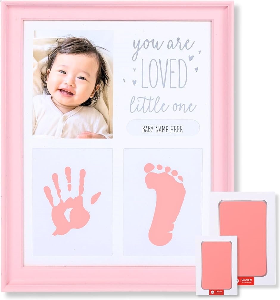 「フォトフレームと転写スタンプのセット」 赤ちゃんやペットの手足を汚さずにかんたんに形が残せる、フィルム転写タイプのスタンプと、かわいらしい樹脂製フォトフレームをセットにしたメモリアルボックスです。
