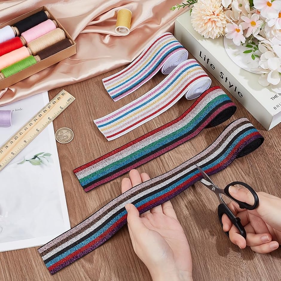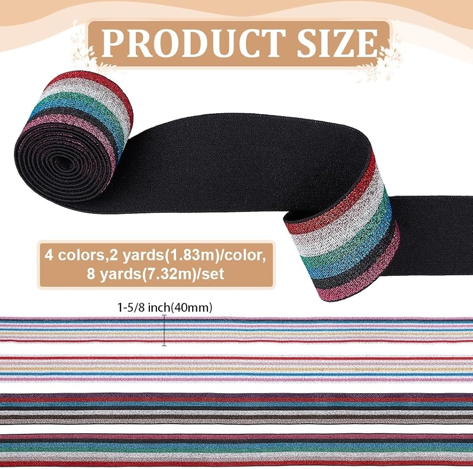 サイズ詳細:パッケージに4ロールのニットゴムバンドが含まれて、1色/ロール、各色2ヤード(1.82m)、合計8ヤード(7.3m)があり、幅は40mmです。