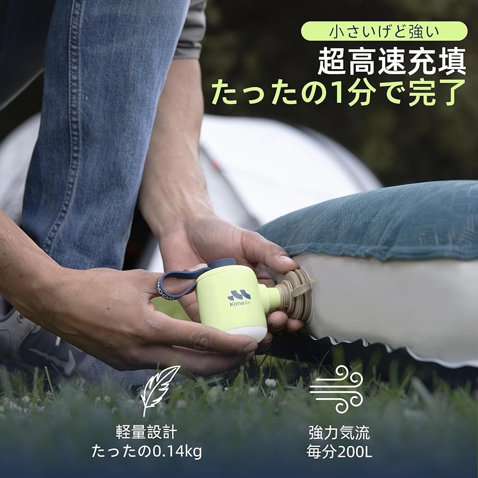 「空気入れ・抜く両用」Kona Air 電動空気入れ の強力な200L/分の風量により、インフレーターマット 浮き輪 プール ゴムボート エアベット ビニールブールへ空気入れと布団や衣類を収納する真空バッグにたった一台で解決。USB充電ケーブル付き、外出や自宅で便利に充電・給電することができます。