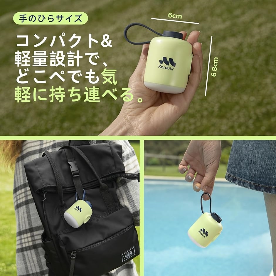 「超コンパクトで携帯性抜群」Kona Air 電動エアーポンプはわずか140gの軽量コンパクト設計で、手にすっぽり収まるサイズ。