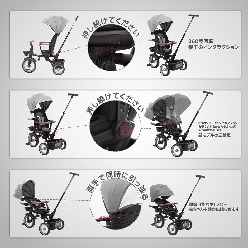 1.ベビーカー(横になれる) 2.ベビーカー(座れる) 3.三輪車(サンシェード&押し棒&背もたれ&ベルト付き) 4.押し棒付き三輪車 5.押し棒を外して通常の三輪車 6.安全ベルト付き三輪車 7.収納と展開できるステップ機能追加。