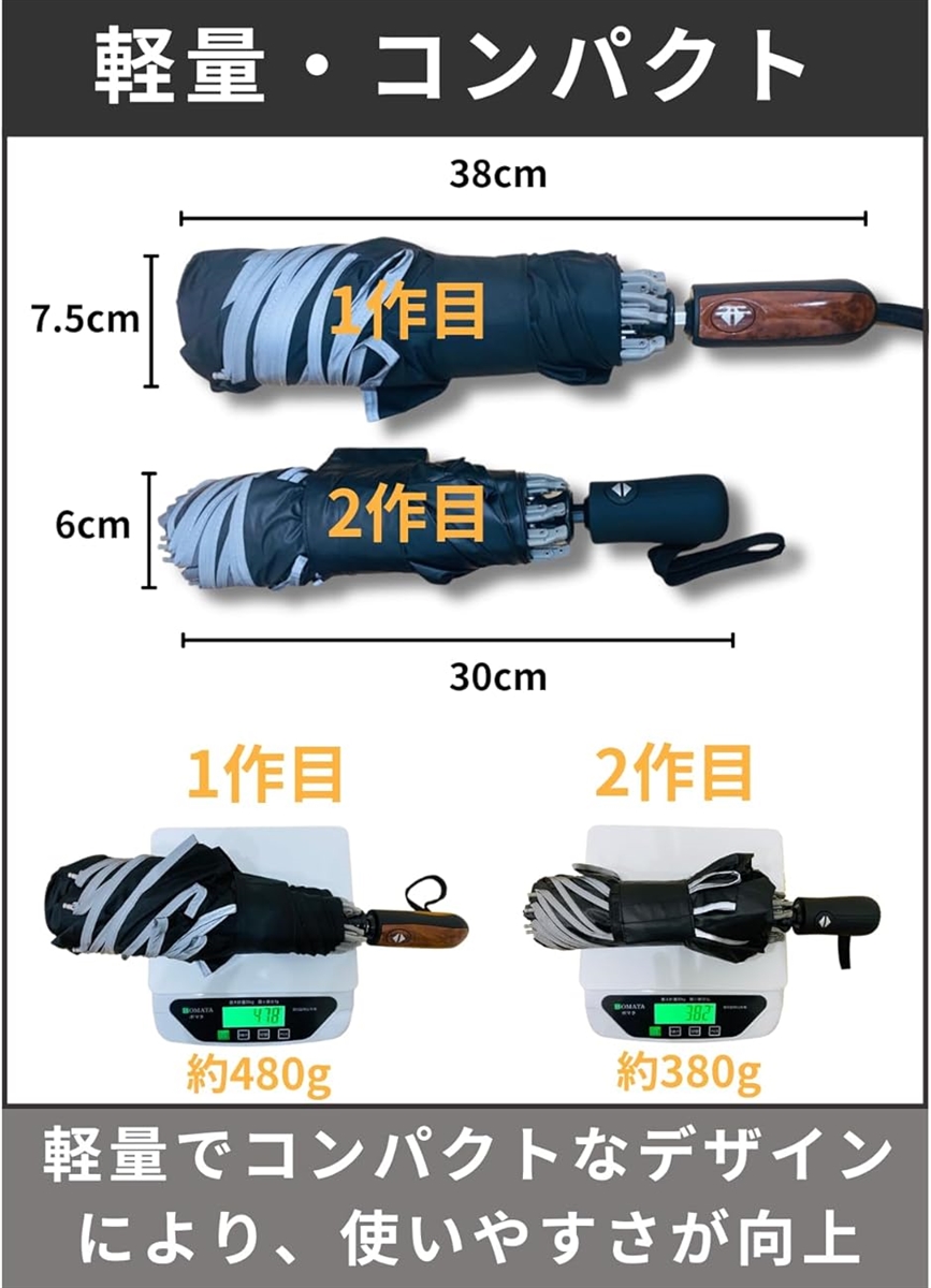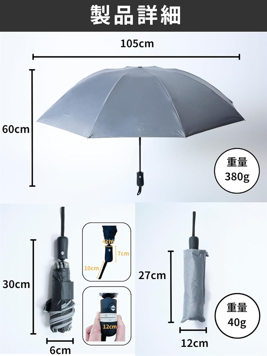 「製品詳細」<開放時のサイズ> 幅:105cm 高さ:60cm <収納時のサイズ> 幅:6.0cm 高さ:30cm <傘本体の重量> 380g <収納ケースの寸法と重量> 寸法:幅12cm 高さ27cm 重量:40g *初めて傘を開く時、逆そりするなどの正常に開かない可能性があります。