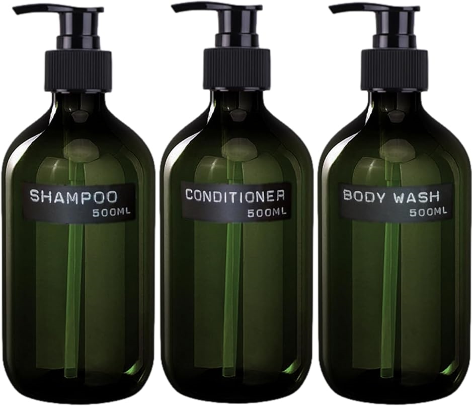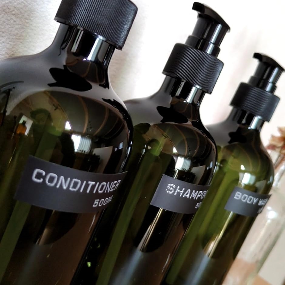 | 商品名 | シャンプーボトル 3本セット 詰め替えボトル ディスペンサー シャンプー コンディショナー ソープ 生活感を隠す クリア 500ml 防水ラベル付き グリーン |