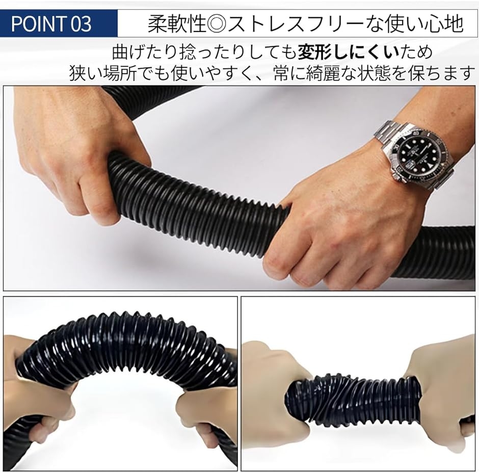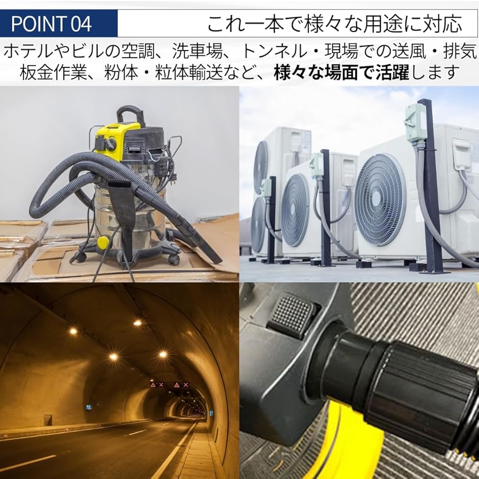 「これ一本で様々な用途に対応」家庭用掃除機、ホテルやビルの空調、洗車場、トンネル・現場での送・排気、板金作業、粉体・粒体輸送など、多様な用途に対応できるホース。