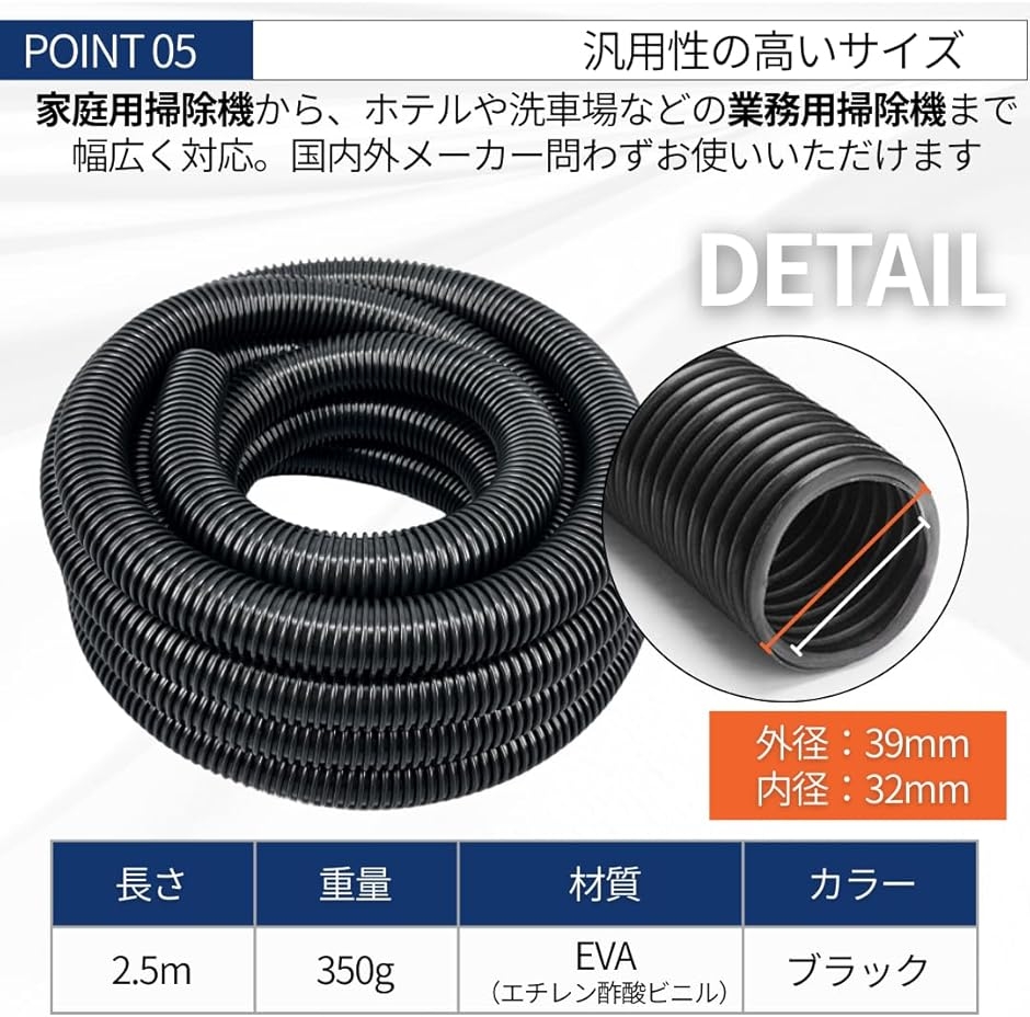 「商品詳細」外径:39mm 内径:32mm 長さ:約2.5m 重量:350g 素材:EVA(エチレン酢酸ビニル) カラー:ブラック