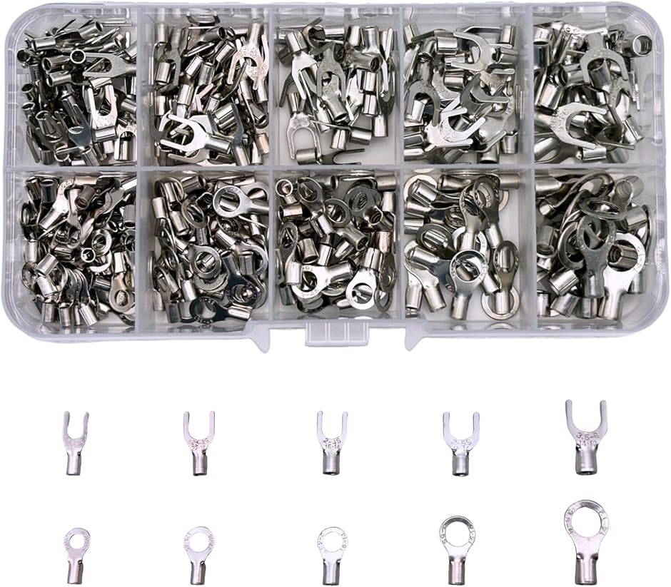 パッケージ内容:320個入れ端子セット 丸型端子5サイズ、U形端子5サイズ、カラー:シルバー、 素材:銅、表面素材:錫メッキ 端子仕様詳細:RNB1.25-3.2x50個、RNB1.25-4x40個、RNB2-4x30個、RNB2-5x20個、RNB3.5-6x20個。