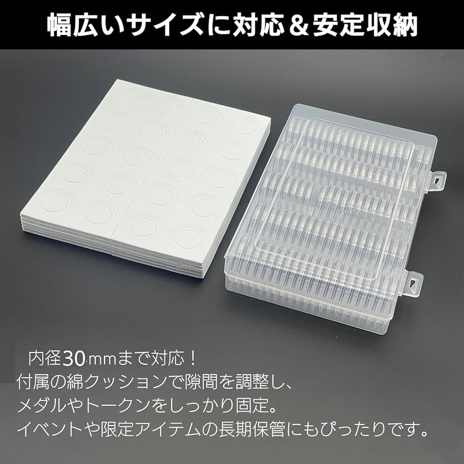 内径30mmまでのサイズに対応しており、多くのトークンやメダルがぴったり収まります。