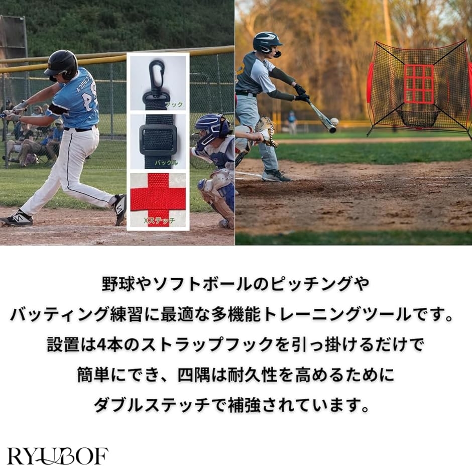 「高品質ナイロン素材採用」耐久性が高く再利用可能なプレミアムナイロンを使用し、調節可能ストラップで6〜8フィートのネットに対応、野球練習の必須アイテムです。