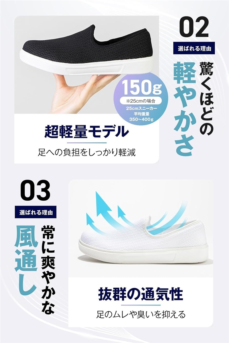 通気性に優れたニット素材が、足の蒸れや不快な臭いを軽減し、いつでも快適で清潔な履き心地を提供します。