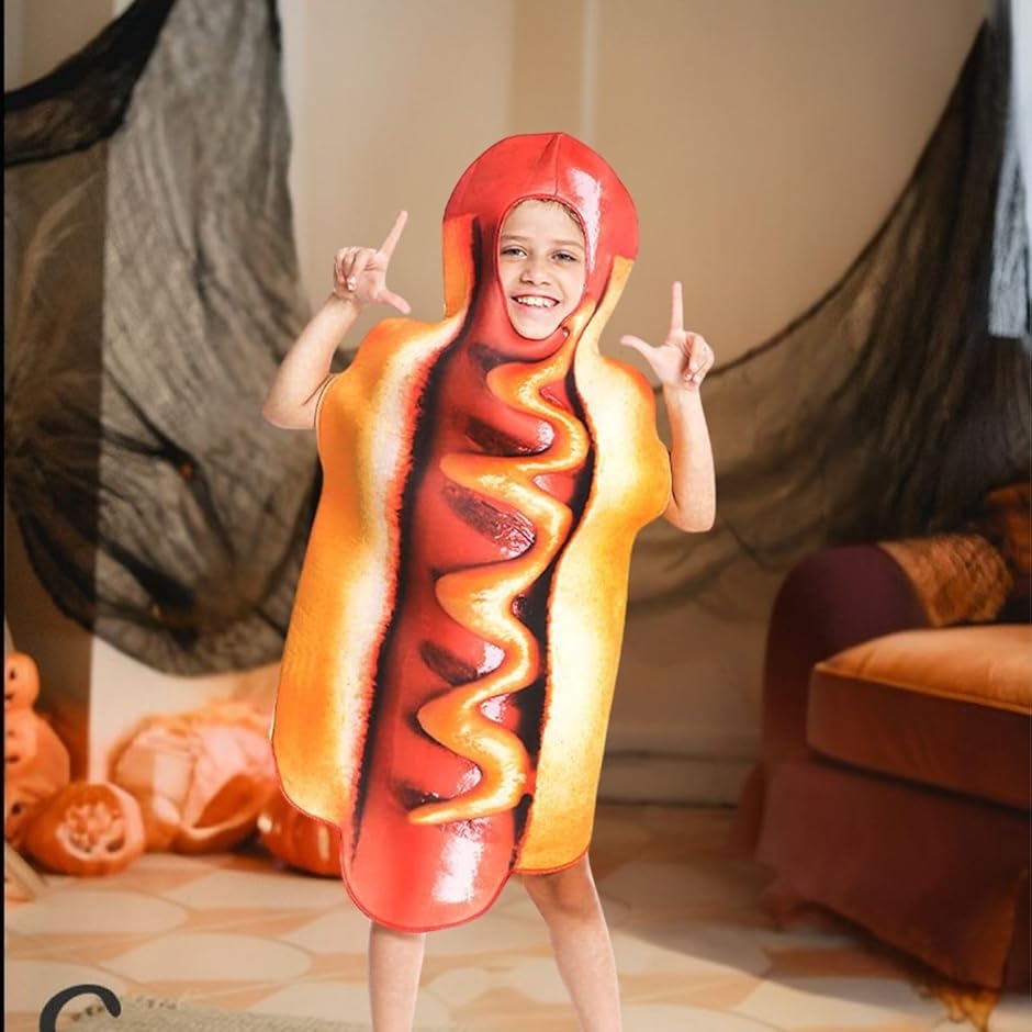 「ユニークなデザインで注目度抜群」思わず笑顔がこぼれるユニークな「ホットドッグ コスプレ 子供用 着ぐるみ」です。