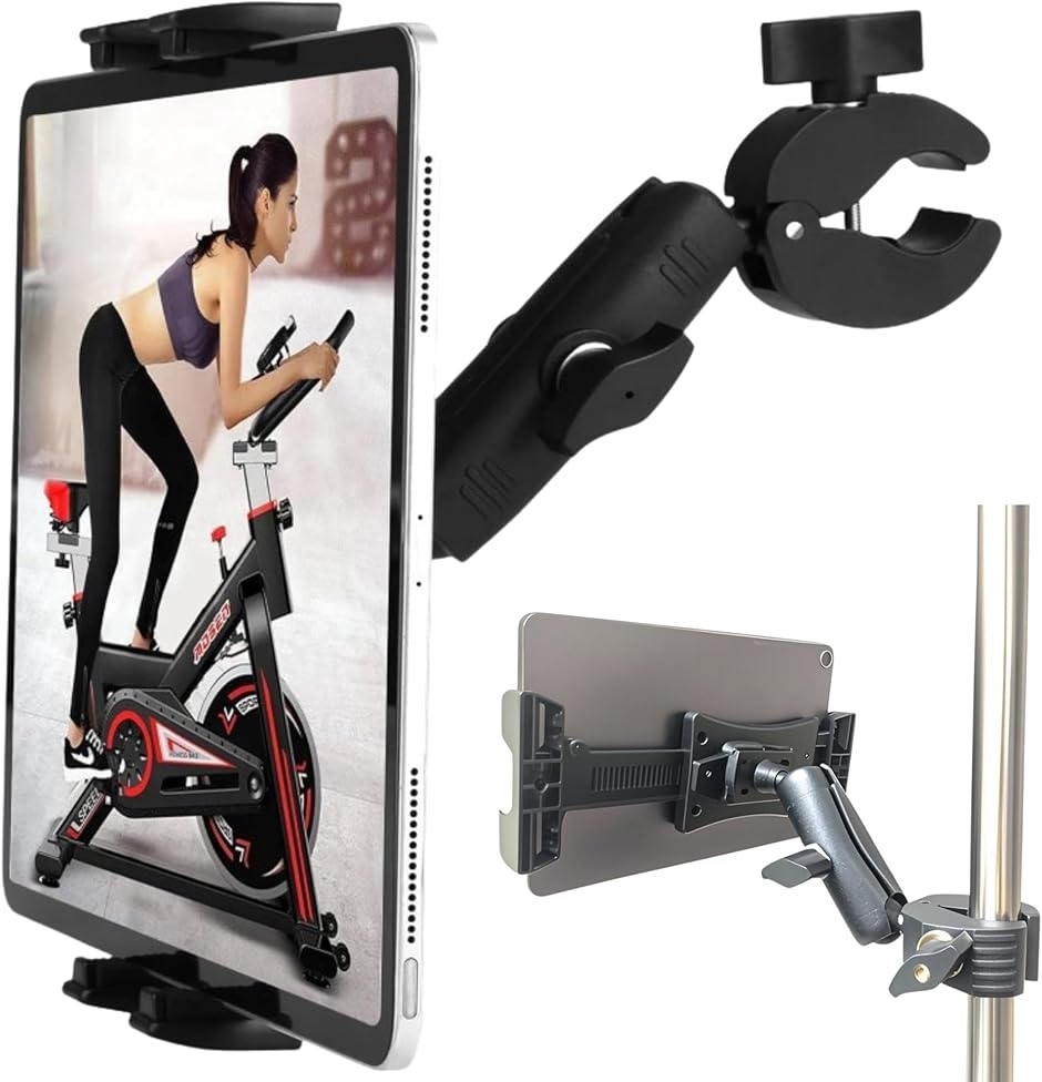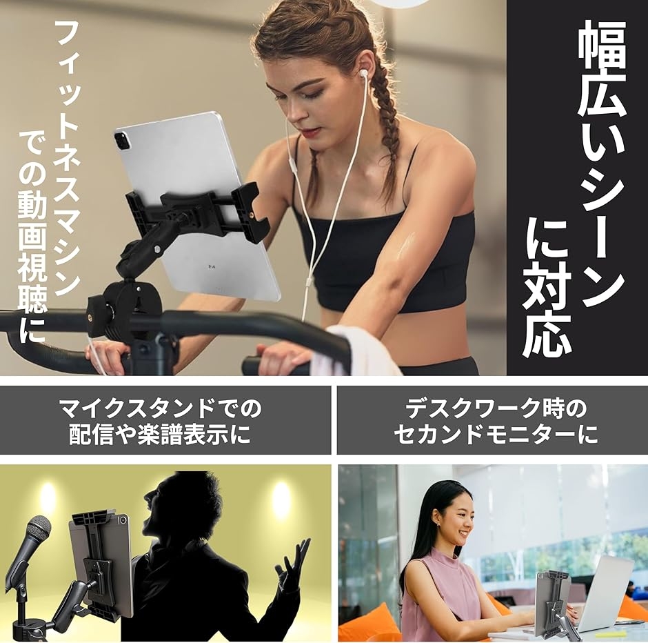 「幅広いシーンに対応した設計」 スピンバイクでの運動中の動画視聴、マイクスタンドでの配信や楽譜表示、デスクワーク時のセカンドモニターなど、様々なシーンで使える多用途タブレットホルダーです。