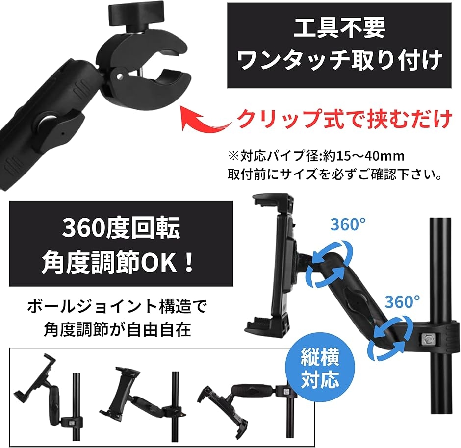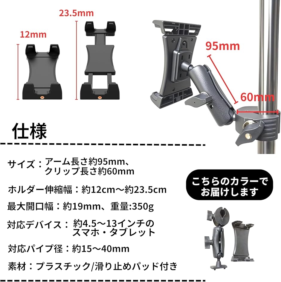 「仕様」サイズ:アーム長さ約95mm、クリップ長さ約60mm、ホルダー伸縮幅約12cm〜約23.5cm、最大開口幅約19mm、重量:350g、対応デバイス:約4.5〜13インチのスマホ・タブレット、対応パイプ径:約15〜40mm、素材:プラスチック/滑り止めパッド付き、カラー:ブラック