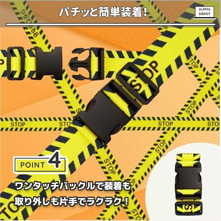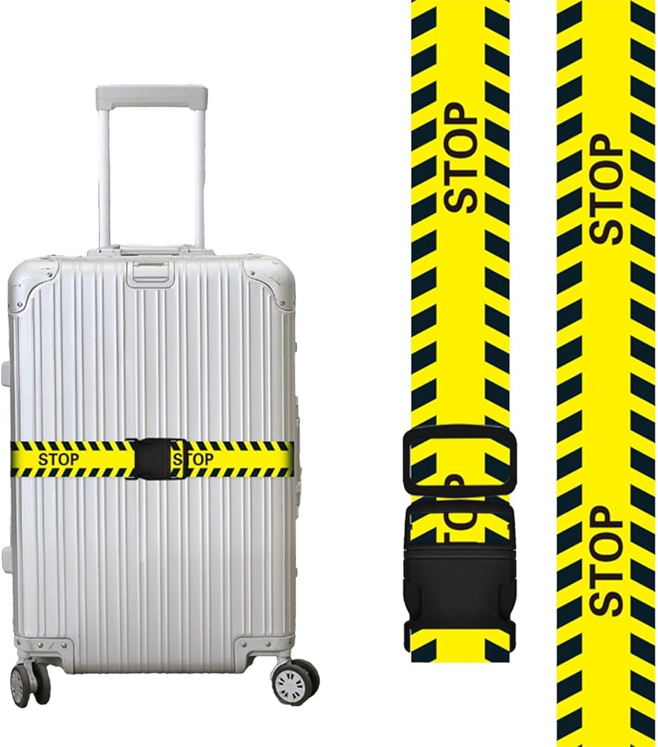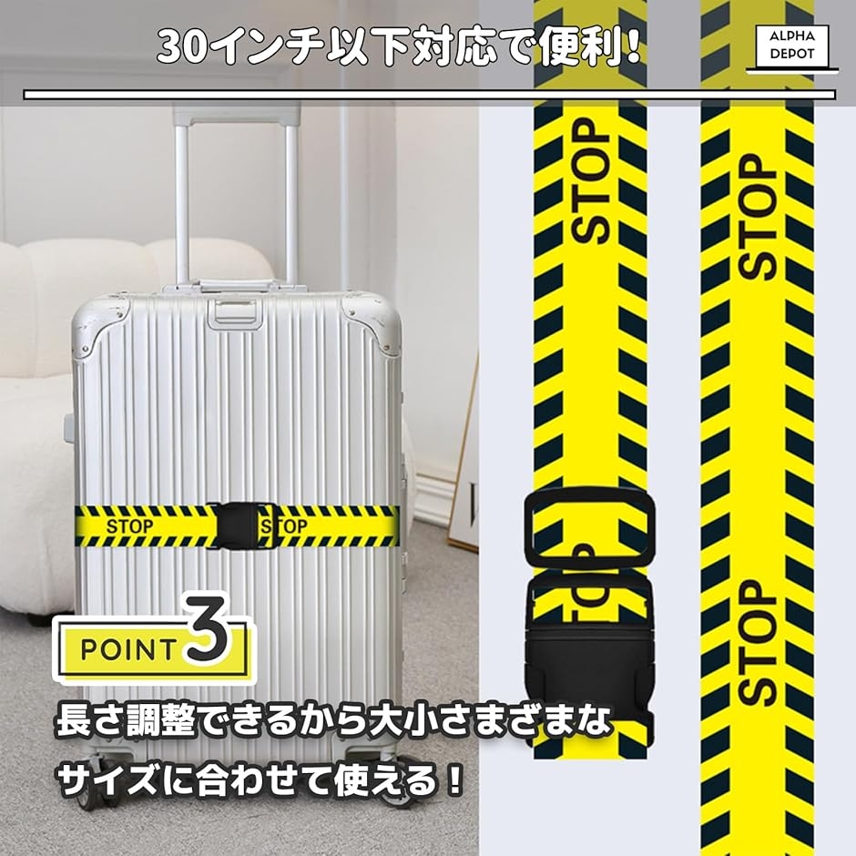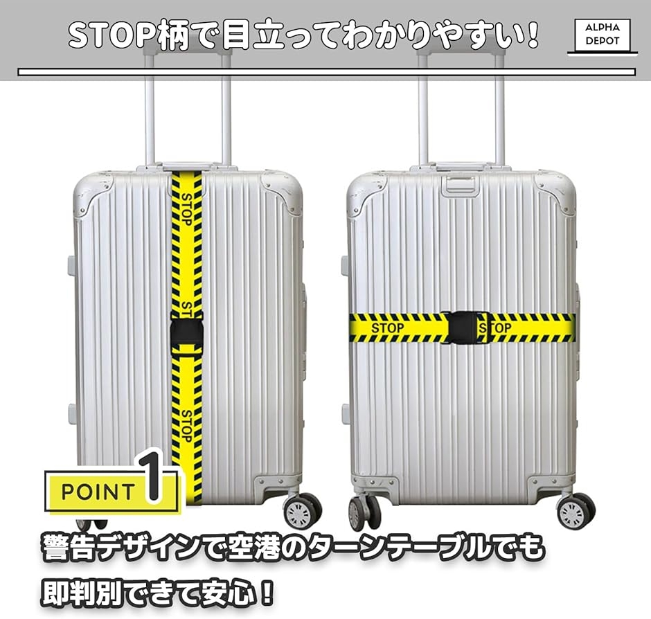 「STOP柄で自分の荷物がすぐ見つかる。」空港や駅のターンテーブルでも目立つ警告風デザインで、スーツケースを一瞬で見分けられて安心です。