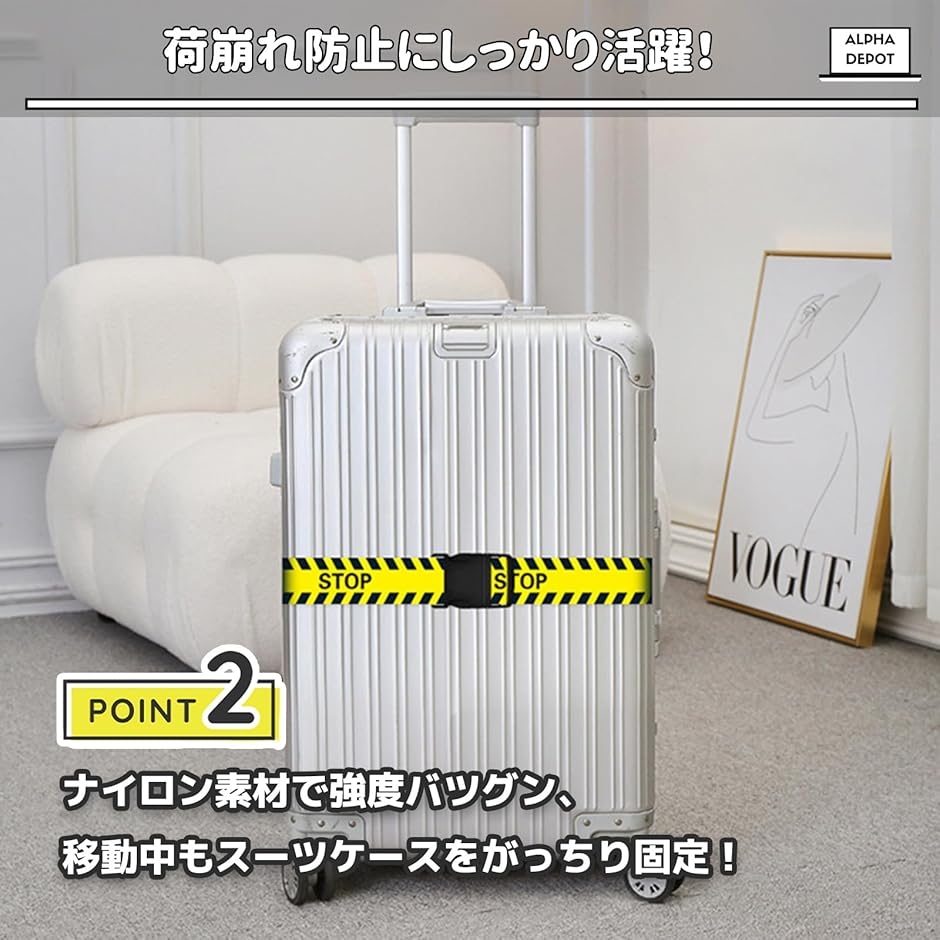 「ナイロン素材で荷崩れ防止。」丈夫なナイロン製ベルトがスーツケースをしっかりホールドし、移動中の揺れや落下を防いでくれます。