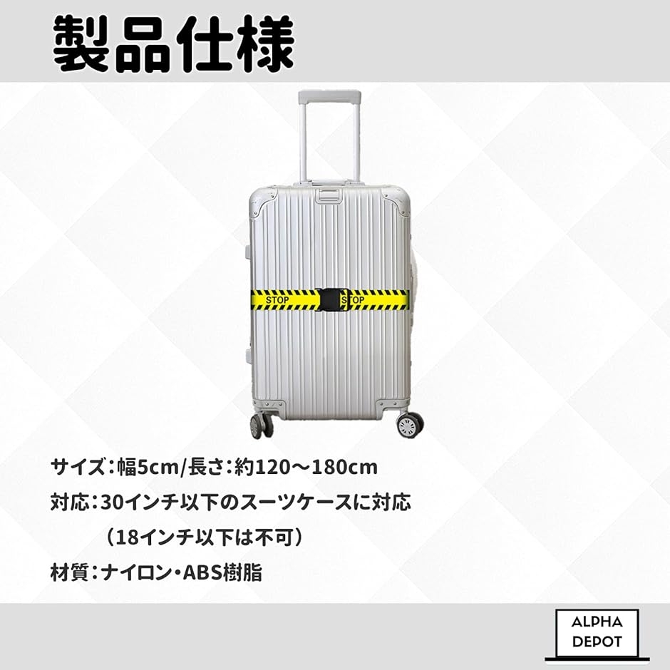 「製品仕様」サイズ:幅5cm/長さ:約120〜180cm/対応:30インチ以下のスーツケースに対応(18インチ以下は不可)/材質:ナイロン・ABS樹脂