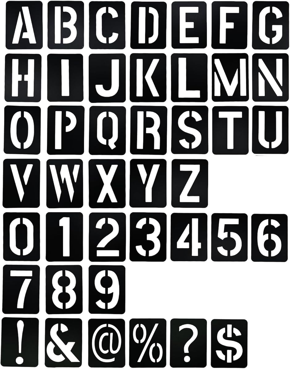 アルファベット(A-Z)、数字(0-9)、よく使用される記号(@、%、$など)を含む42枚の再利用可能なテンプレートが含まれています。