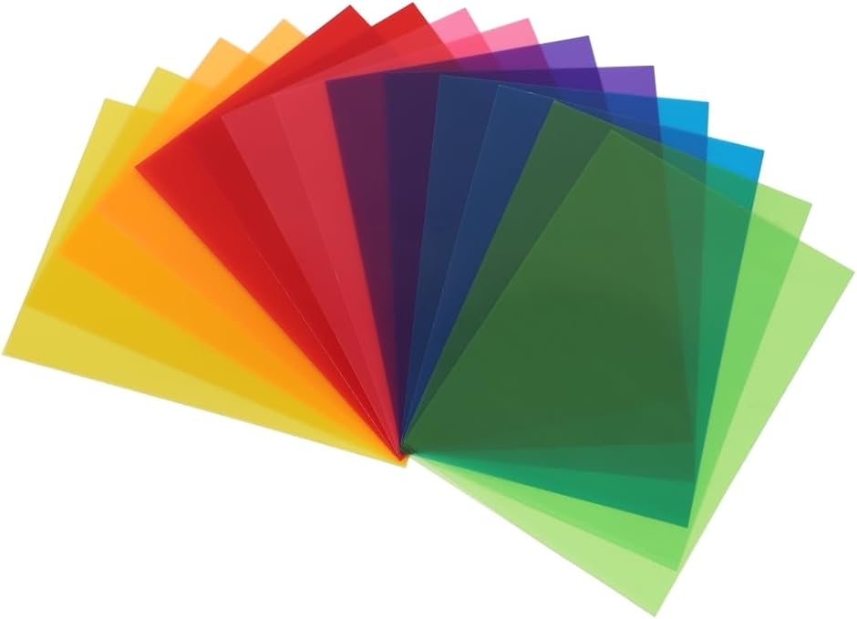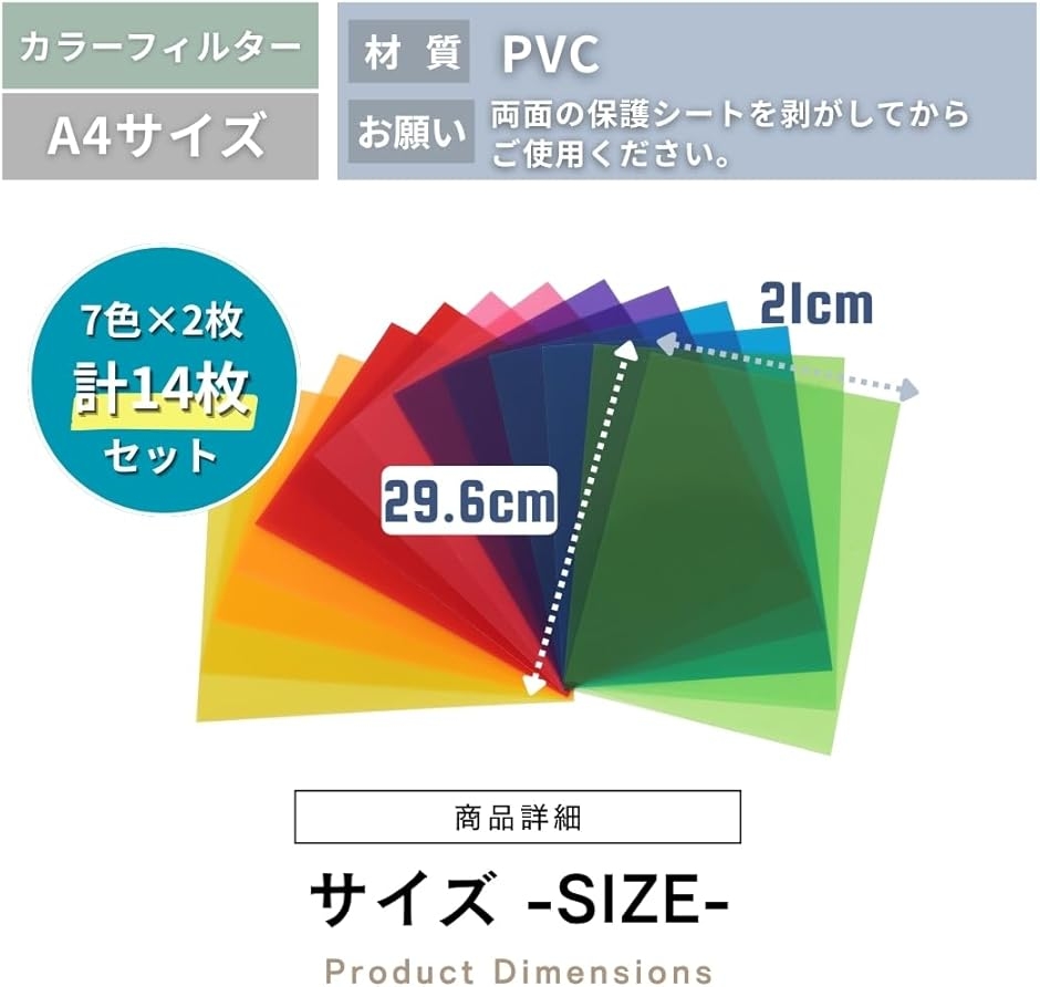 「商品内容」パッケージ内容:カラーフィルター計14枚(青、黄、赤、紫、緑、ピンク、オレンジ、各2枚) サイズ:縦29.6 cm 横21cm 厚さ0.3mm、素材:PVC *サイズ詳細は商品画像をご確認ください。