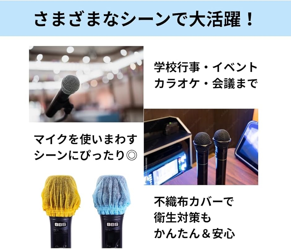 衛生的な使い捨て仕様で清潔をキープ マイクに直接口を近づける使用環境において、雑菌やウイルスの付着を防止するため、マイクカバーの衛生管理は重要です。