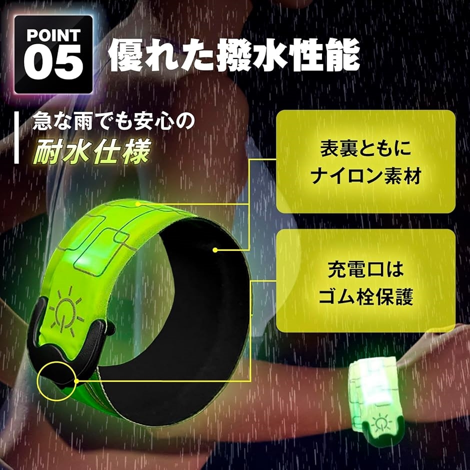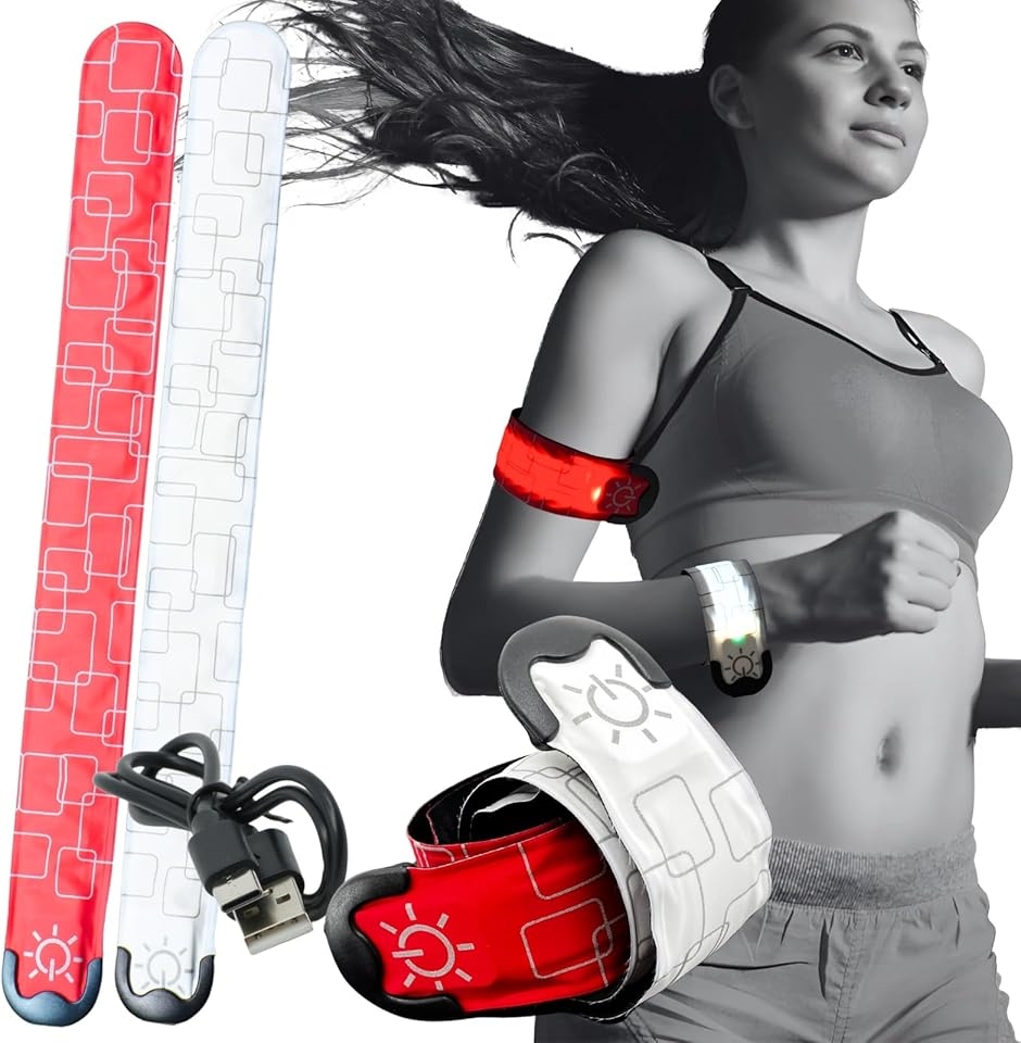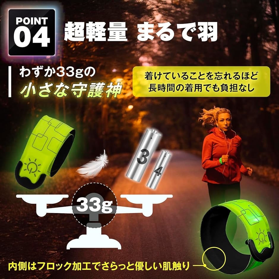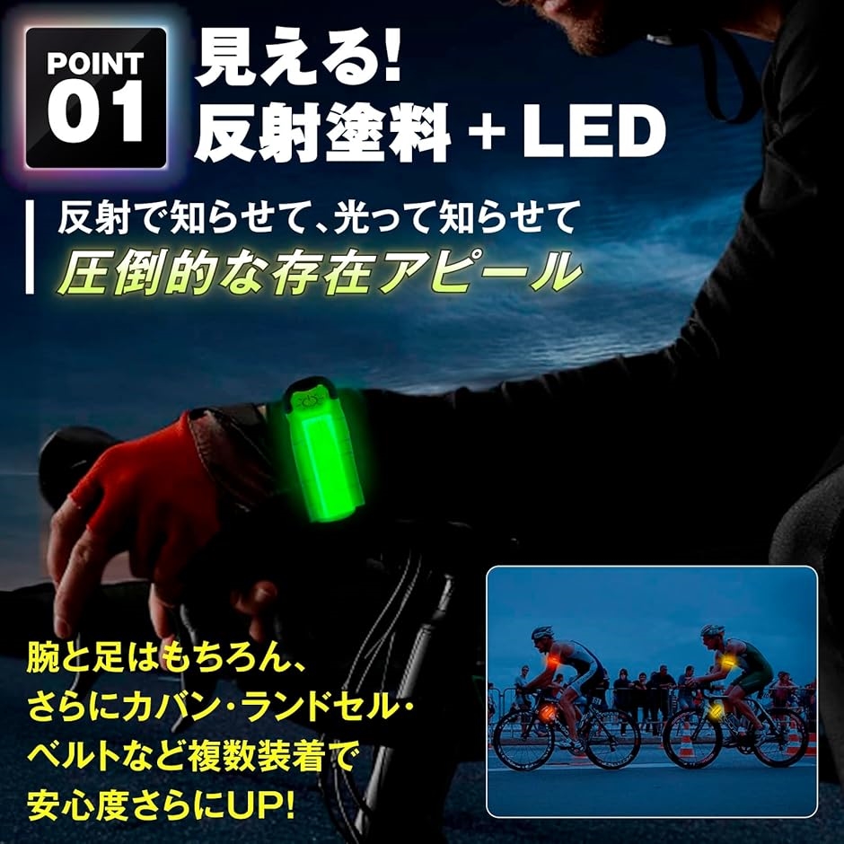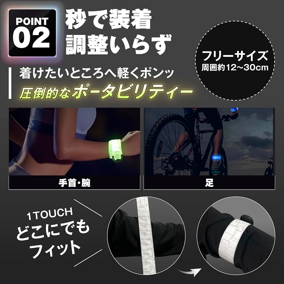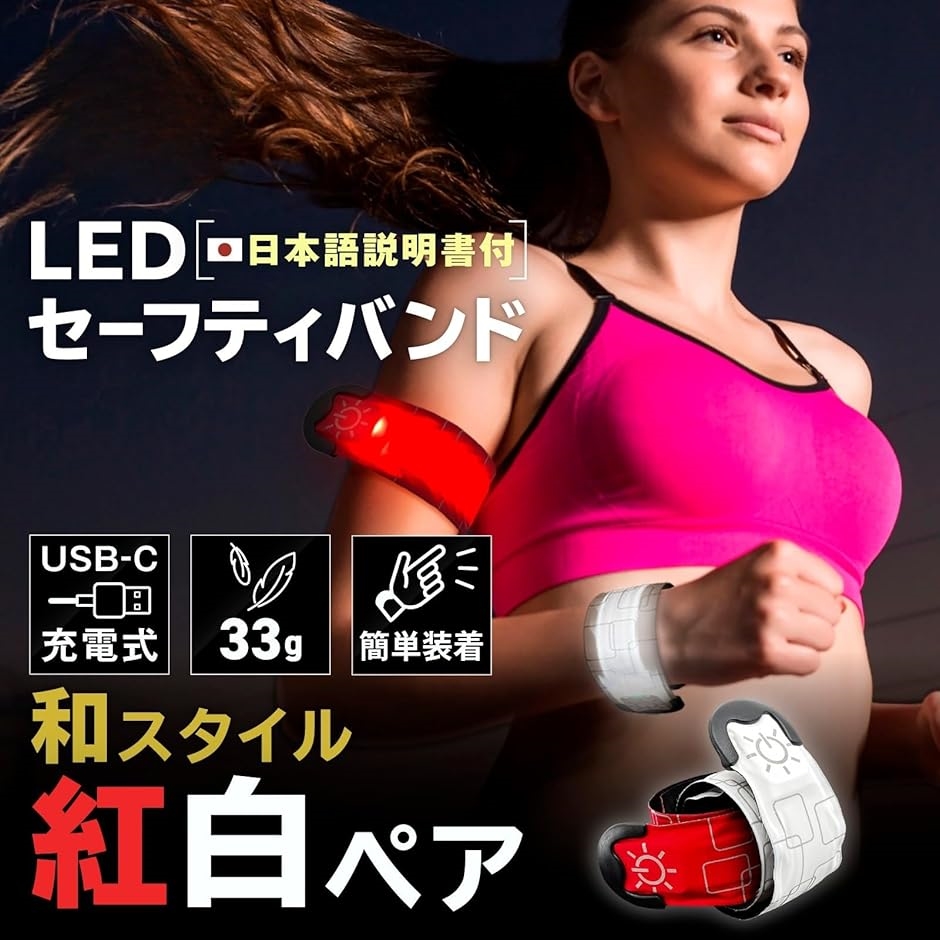 夜間の歩行者は本当に見えない。、大切な人を守るため、LEDセーフティバンドの反射と光で自己防衛を。、腕と足はもちろん、さらにカバン・ランドセル・ベルトなど複数装着で安心度さらにUP。、紅白セットでちょっとおしゃれに、ランニング、ジョギング、ウォーキング、サイクリング、散歩のお供に。