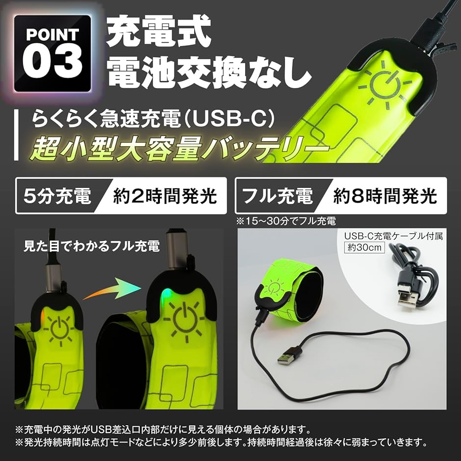 「充電式で電池交換不要。」超小型大容量バッテリー&急速充電、充電時間は5分〜30分(5分充電で約2時間発光、15〜30分で充電完了し約8時間発光)、USB-Cでらくらく充電、充電しやすさ抜群のLEDアームバンド