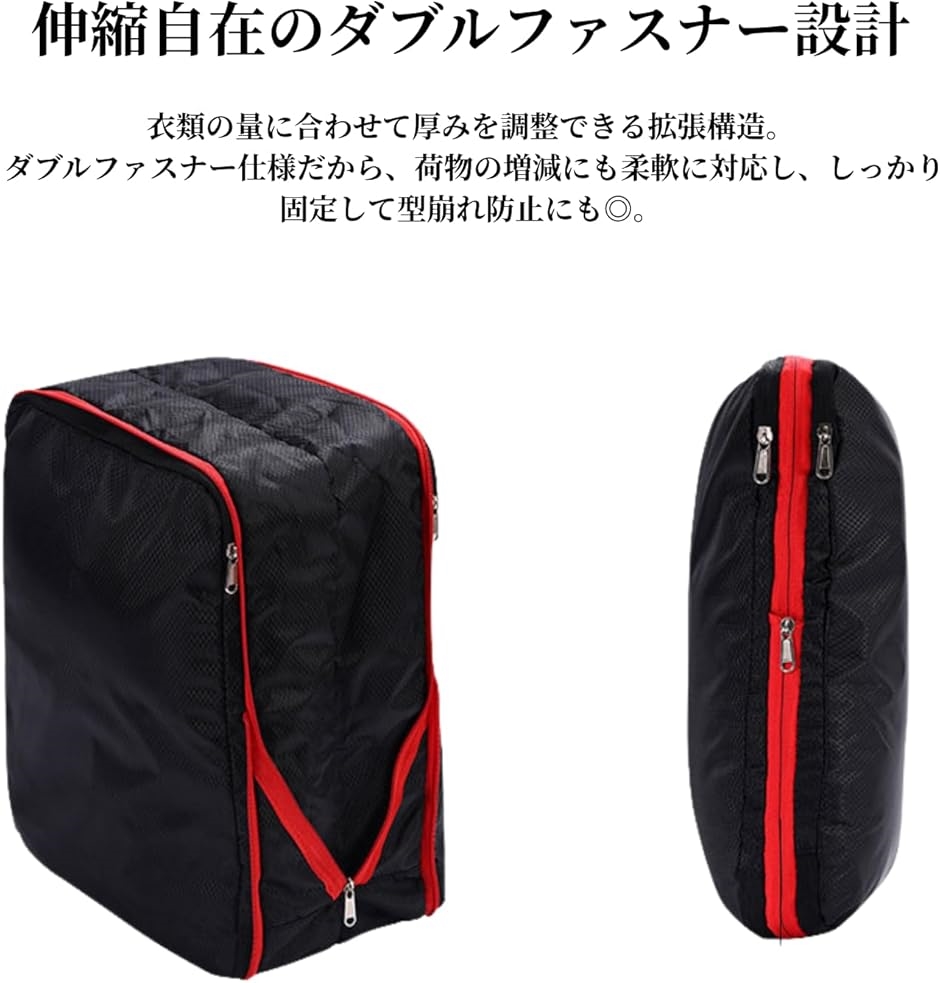 「ファスナーを閉めるだけで簡単圧縮」 衣類を畳んでファスナーを閉じるだけで約50%圧縮。かさばる荷物をスッキリ整理し、快適な旅行をサポートします。