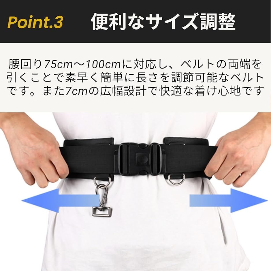 「便利なサイズ調整」腰回り75cm〜100cmに対応し、ベルトの両端を引くことで素早く簡単に長さを調節可能なベルトです。