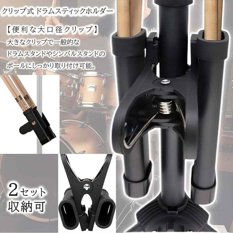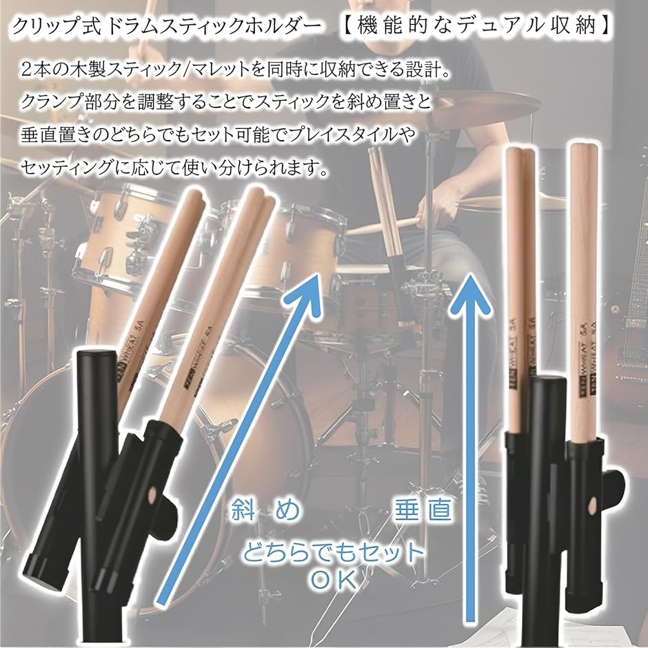 1.クリップ式 ドラムスティックホルダー 演奏を止めない。スムーズなスティック交換を実現するプロ仕様のホルダー このクリップ式ドラムスティックホルダーは、ドラムやパーカッションの演奏中に予備のスティックを素早く交換できるように設計された実用的なアイテムです。