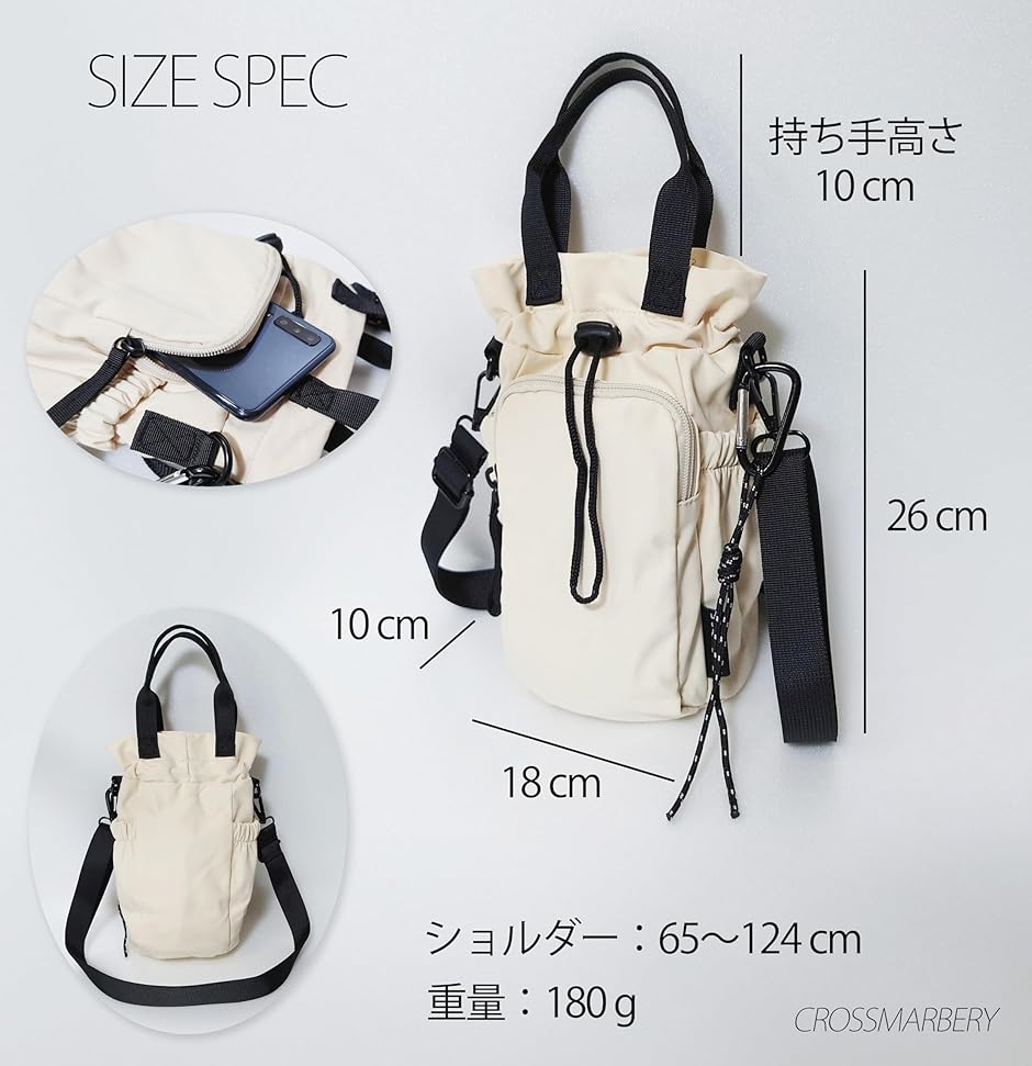 「素材」ナイロン 「仕様」開閉:巾着、内側:メッシュポケットx1、外側:オープンポケットx2、ファスナーポケットx1、カラビナx1 「サイズ」横幅:18cm、高さ:26cm、マチ:10cm、持ち手高さ:10cm、ショルダー:65cm〜124cm 「重さ」約180g * ペットボトル500mlが2本収納可能ですが形状により不可能な場合がございます。