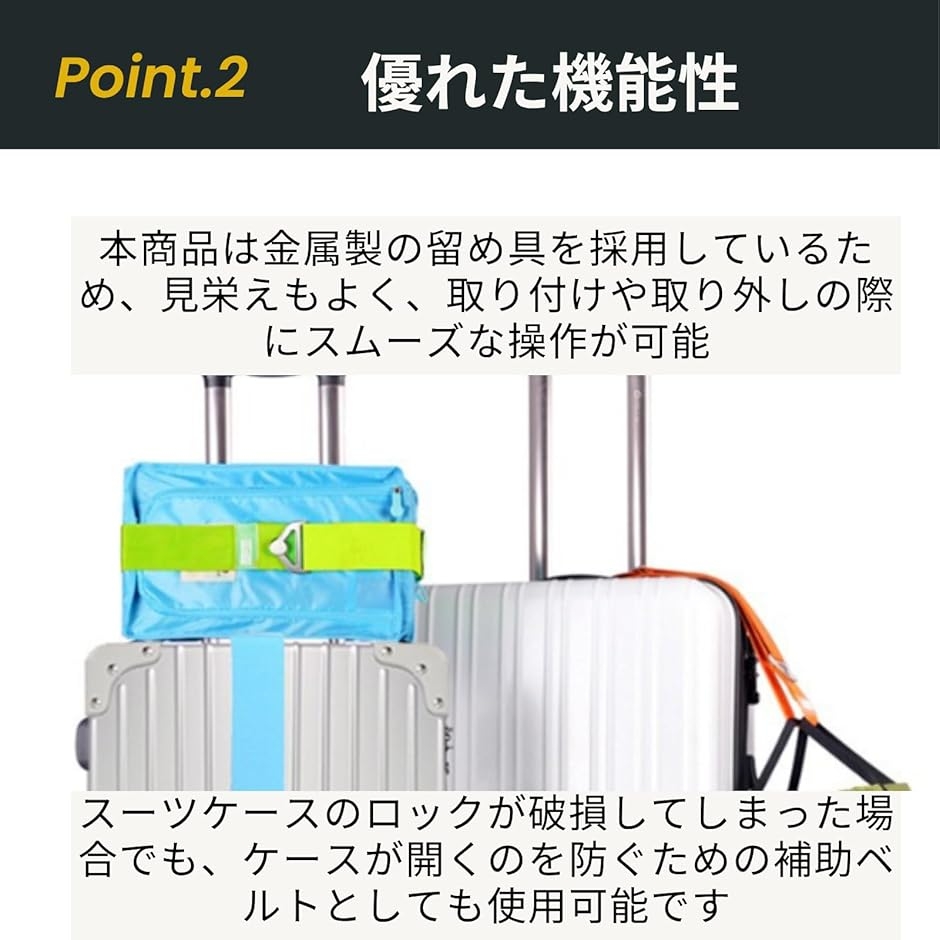 「便利なケースベルト」高弾性ベルトと金属留め具を採用し、キャリーケースの荷崩れや飛び出しを防ぐ固定ベルトです。
