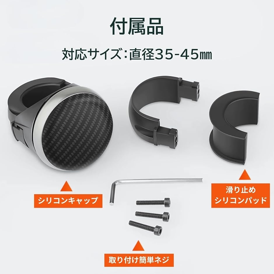「ユニバーサル対応。工具不要の簡単取り付け」 直径35-45mmのハンドルに対応しており、普通車、軽自動車、大型車、軽バン、フォークリフト、船、ボートなど幅広い車両に装着可能。
