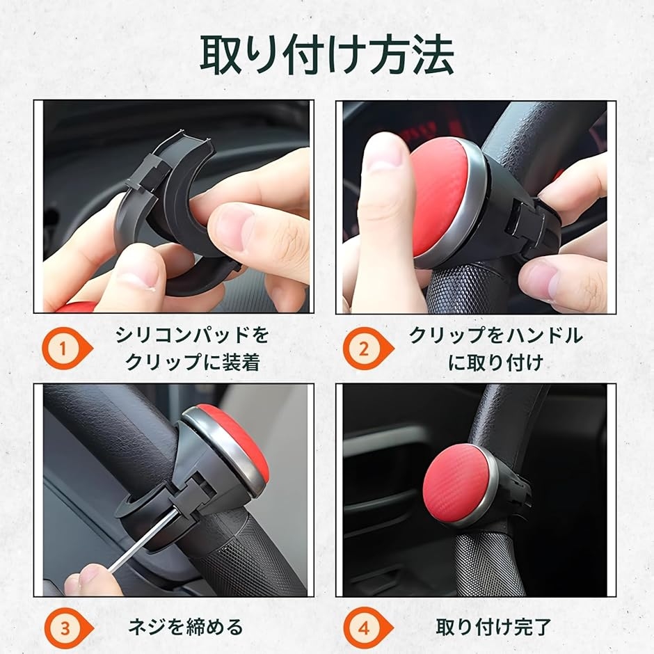 「360度回転。片手でラクラク運転」ハンドルスピンナーで快適ドライブ。 運転中にハンドル操作が重く感じることはありませんか?特に軽自動車、普通車、大型トラック、ハイエース、軽トラなど、車種を問わず狭い駐車場や細い道での切り返しはストレスの元。
