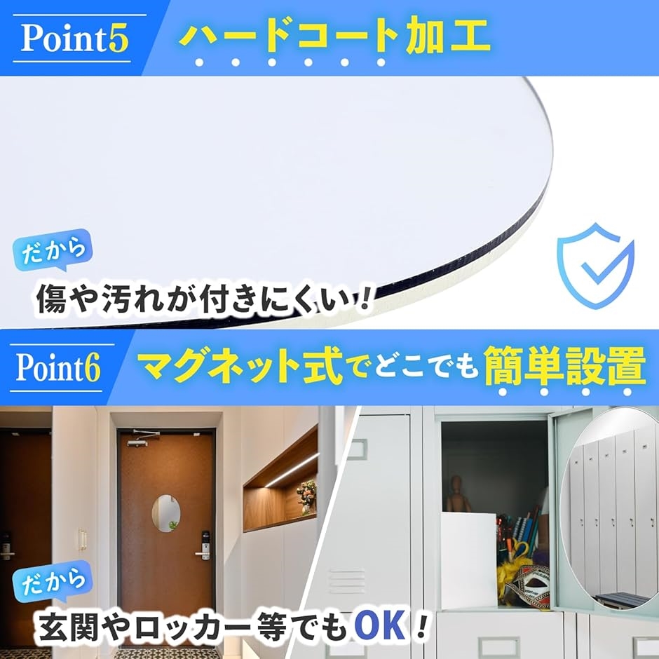 1.曇り止め加工、 2.強力マグネット式、3.こだわりの映像、4.割れない、5.ハードコート加工(汚れ・傷防止)の特徴があります。