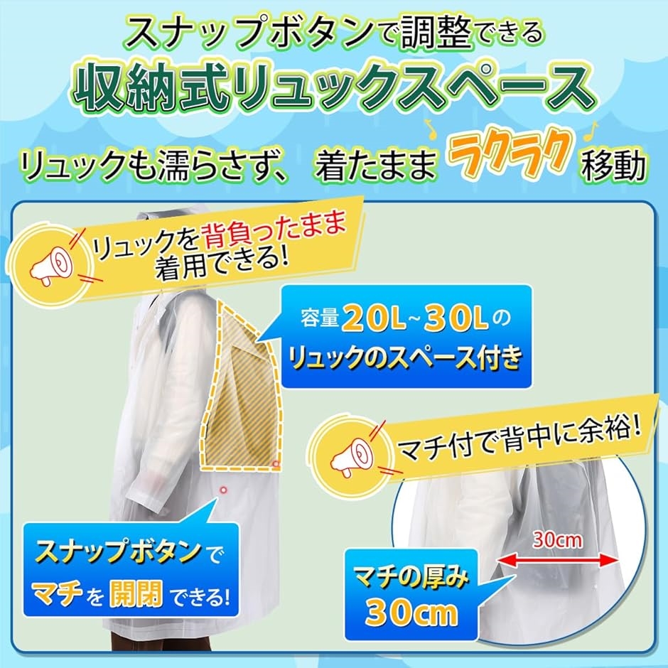 | 商品名 | レインコート リュック対応 防災士監修 マチが大きい 背中スナップ 撥水 軽量 収納袋付き |