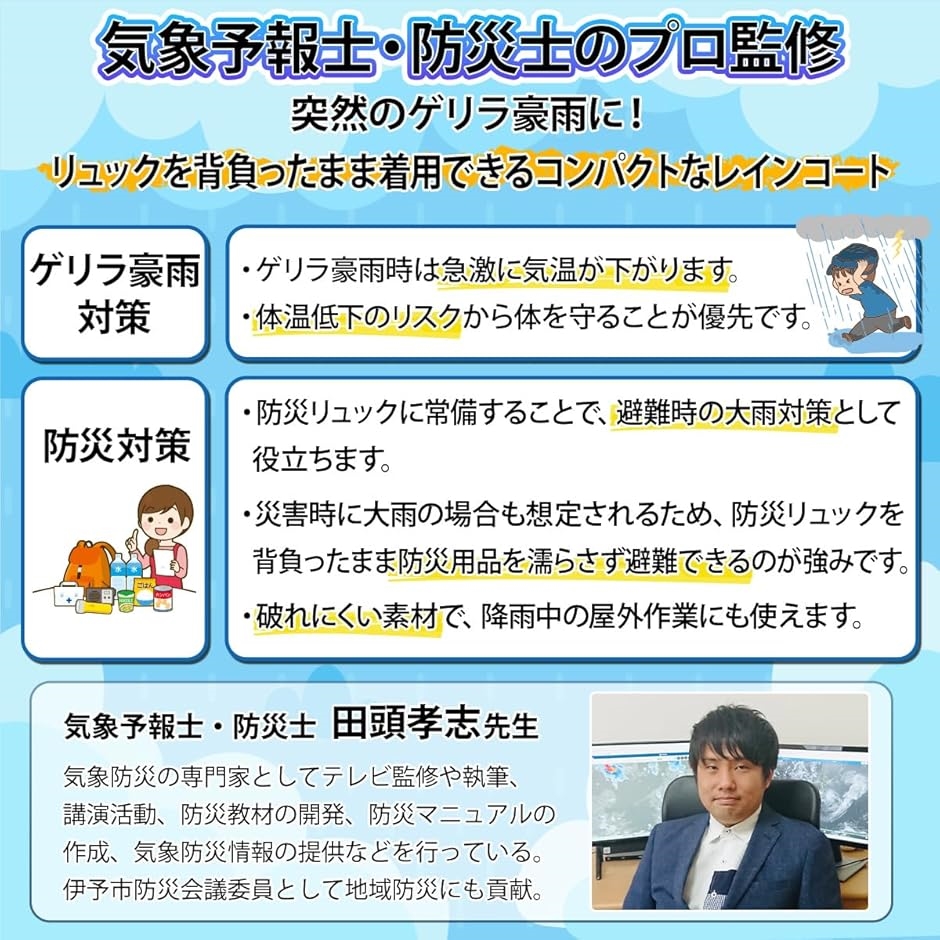 「気象予報士・防災士 田頭孝志先生による監修 ― 防災グッズとして」 気象と防災の専門家が監修し、豪雨・ゲリラ雷雨を想定した仕様を追求。