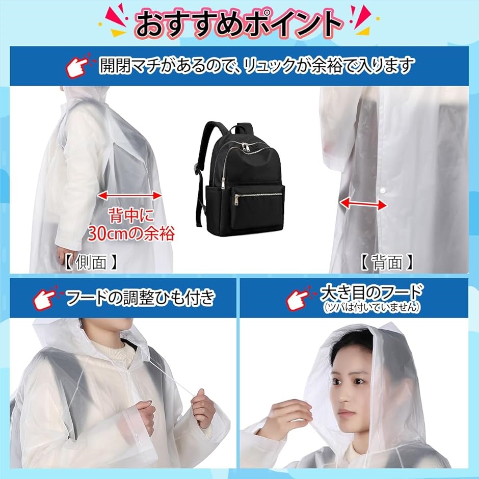 「厚手設計の生地で破れにくい」 一般的な使い捨てレインコートとは異なり、やや厚めのEVA素材を使用しています。