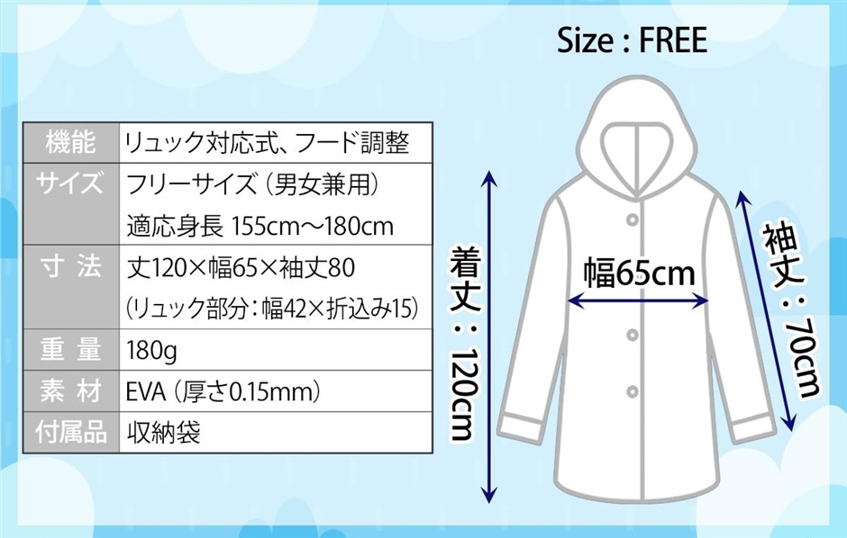 | 商品名 | レインコート リュック対応 防災士監修 マチが大きい 背中スナップ 撥水 軽量 収納袋付き |