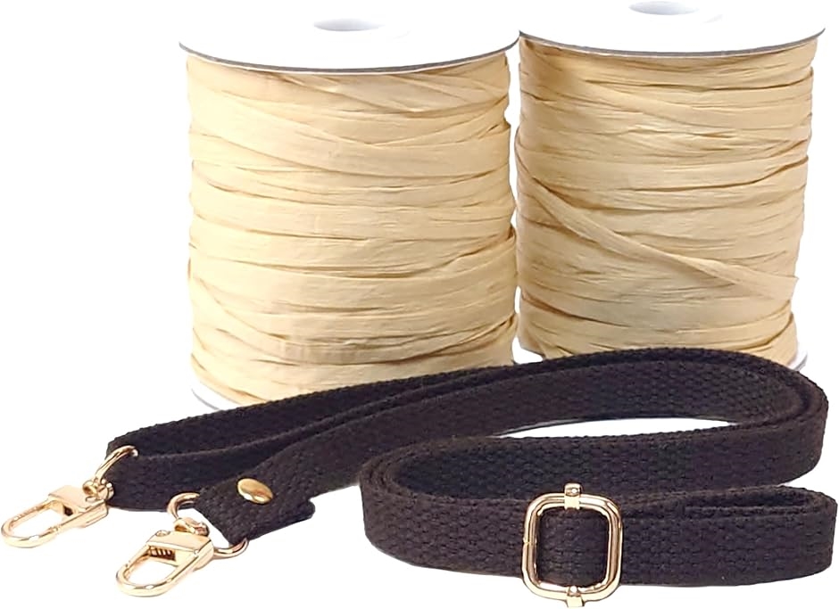 「ラフィアヤーン」40g(80m)x2個 素材:ラフィアレーヨン 「ショルダーベルト」幅:12mm 長さ:73〜135cm*調節可 素材:コットン、合金 生産国:中国