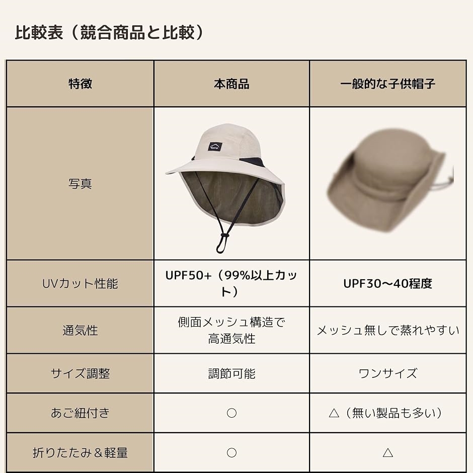 | 商品名 | UPF50+ UVカット アウトドア 帽子 日よけ 子供 大人 用 通気 メッシュ 登山 キャンプ 通園 通学 折りたたみ 3色 |