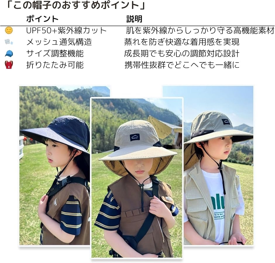 | 商品名 | UPF50+ UVカット アウトドア 帽子 日よけ 子供 大人 用 通気 メッシュ 登山 キャンプ 通園 通学 折りたたみ 3色 |