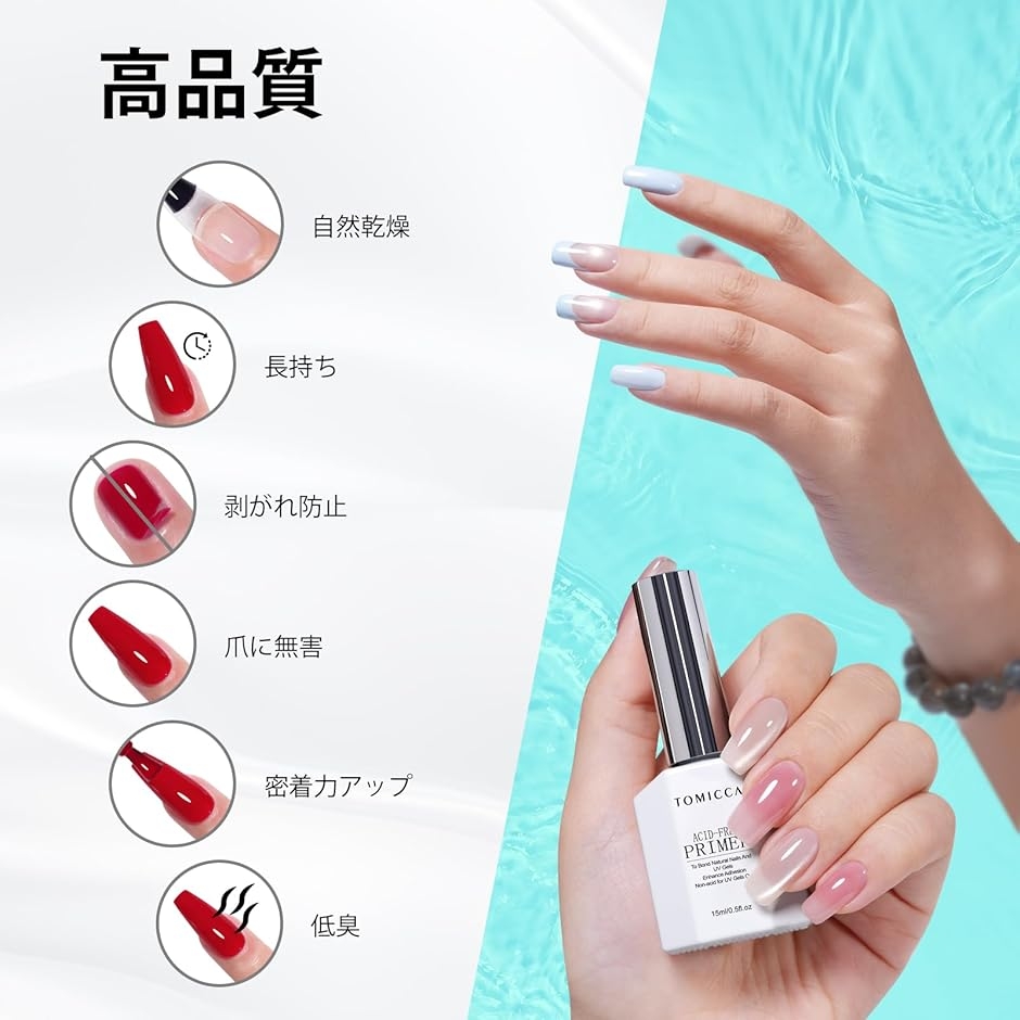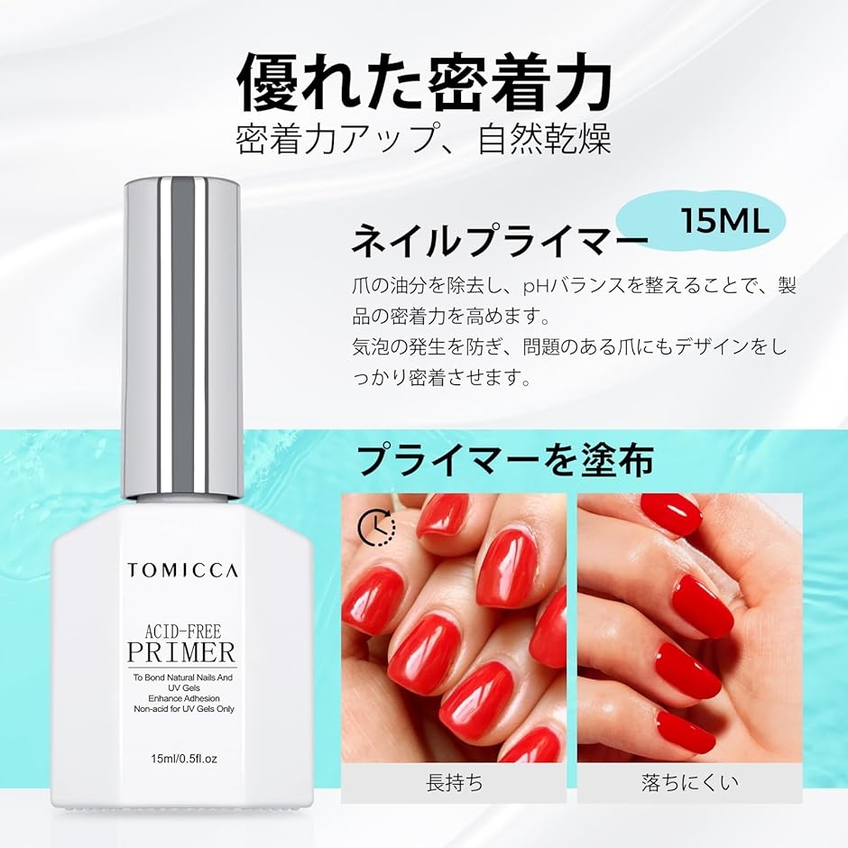 パッケージ内容:TOMICCA ネイルプライマー 15ml:ネイルの下地を作るには、セットで爪の表面を整えることが、プロのマニキュアにおいて重要なステップです。
